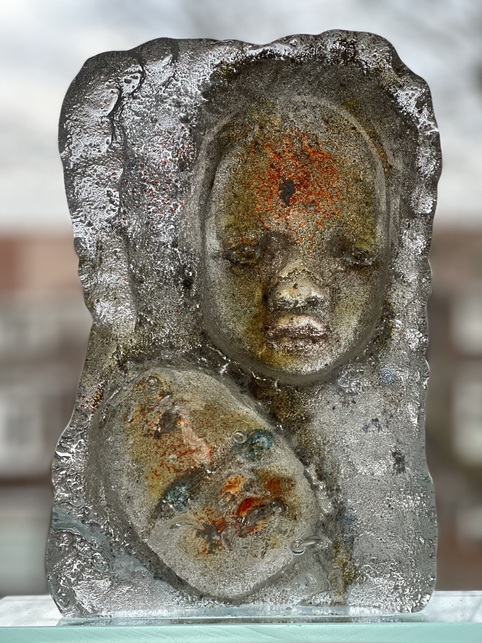 In zand gegoten portretten, waarbij warme kleuren zijn toegepast.