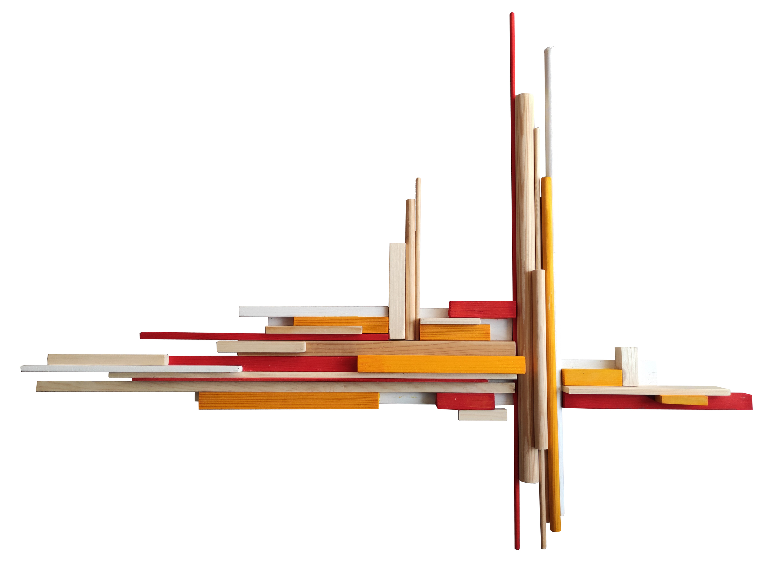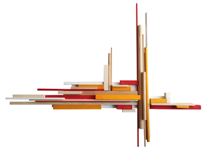 Wandsculptuur van hout, gedeeltelijk gelakt in meerdere kleuren