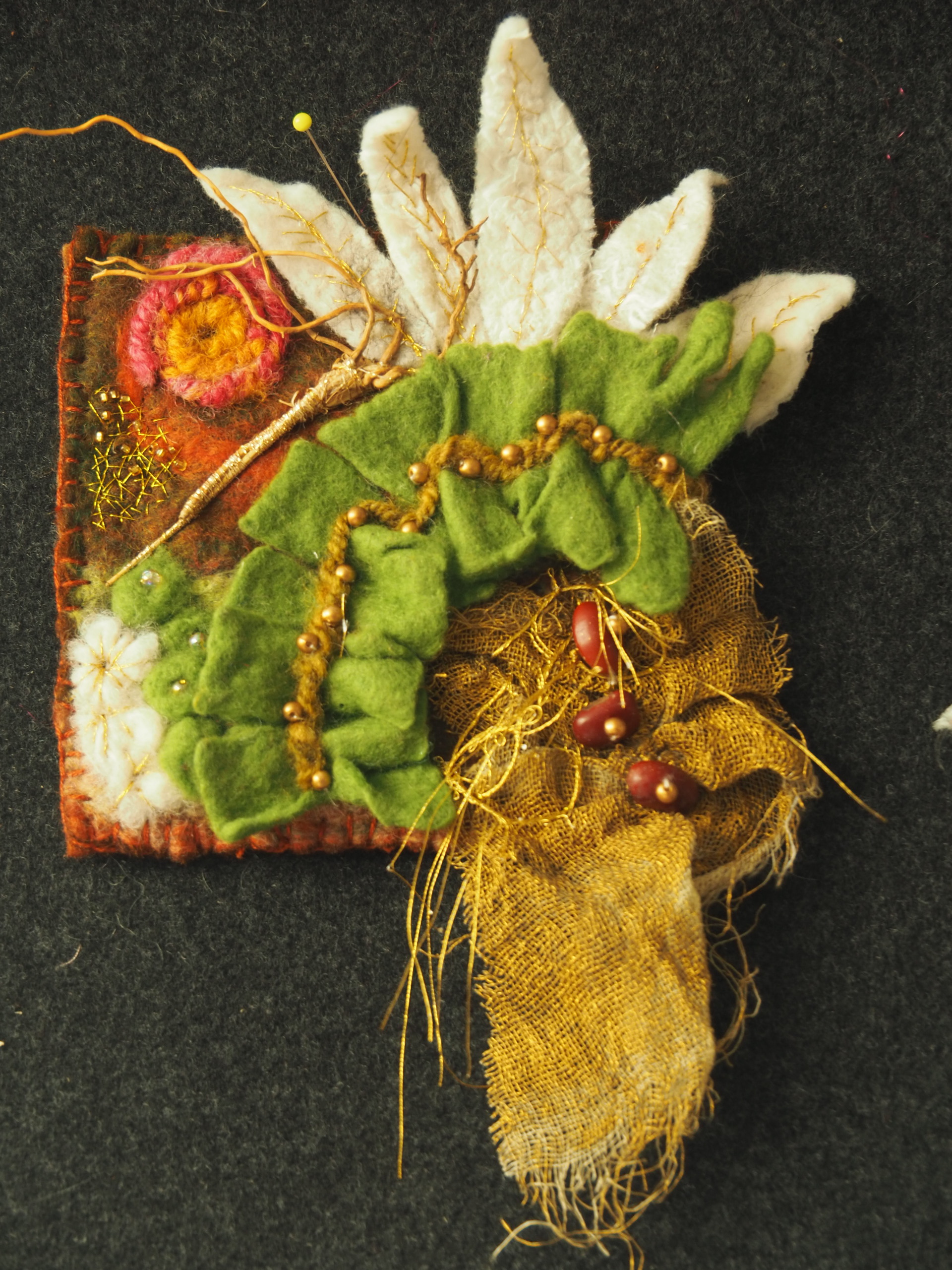 Miniatuur wandhanger in groen/wit met goud met takjes, franje en kralen als een stukje bosbodem. Gevilte wol met diverse soorten decoratie.