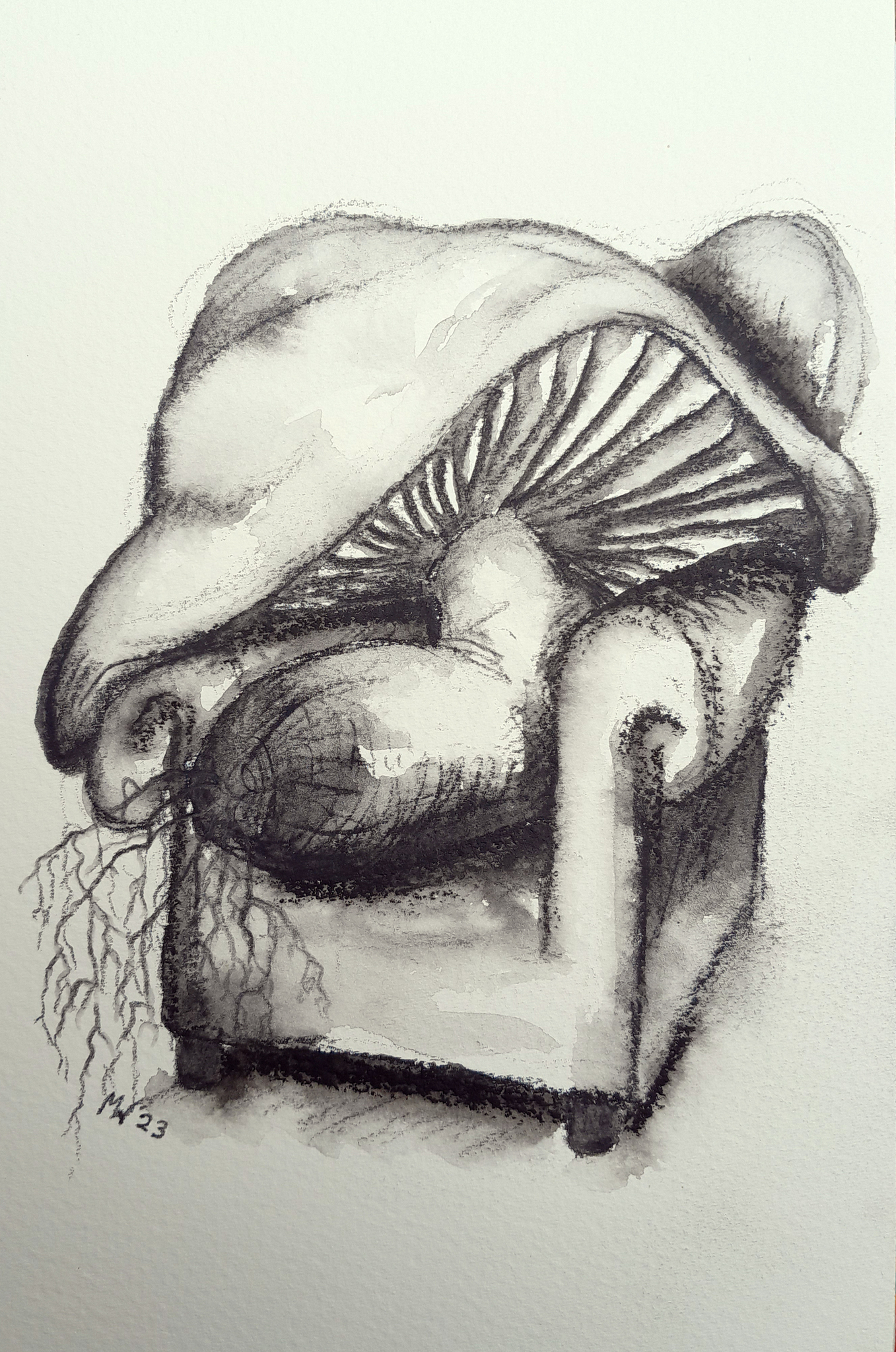 Deze vermoeide paddenstoel zit als een zoutzak in zijn fauteuil. Aquarelpotloden en water op 300 grams aquarelpapier.