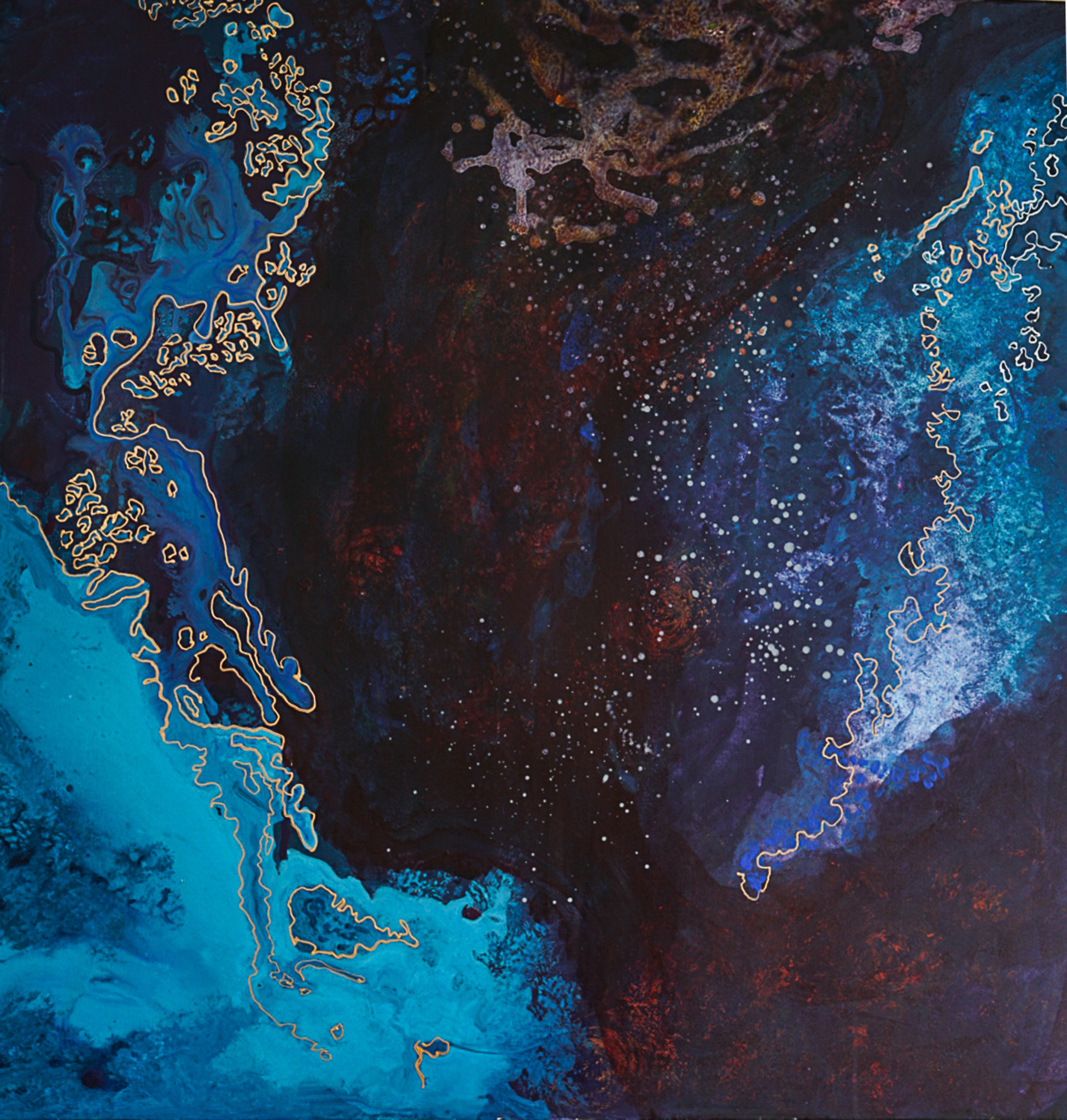 Is het de zee of is het de lucht? Zijn het zeestromen of zijn het eilanden? Is het in de ruimte? Is het ver of dichtbij? Het is een gevoel. lZowel zee als de ruimte hebben mijn interesse. Die fascinatie probeer ik te vangen in mijn werk.