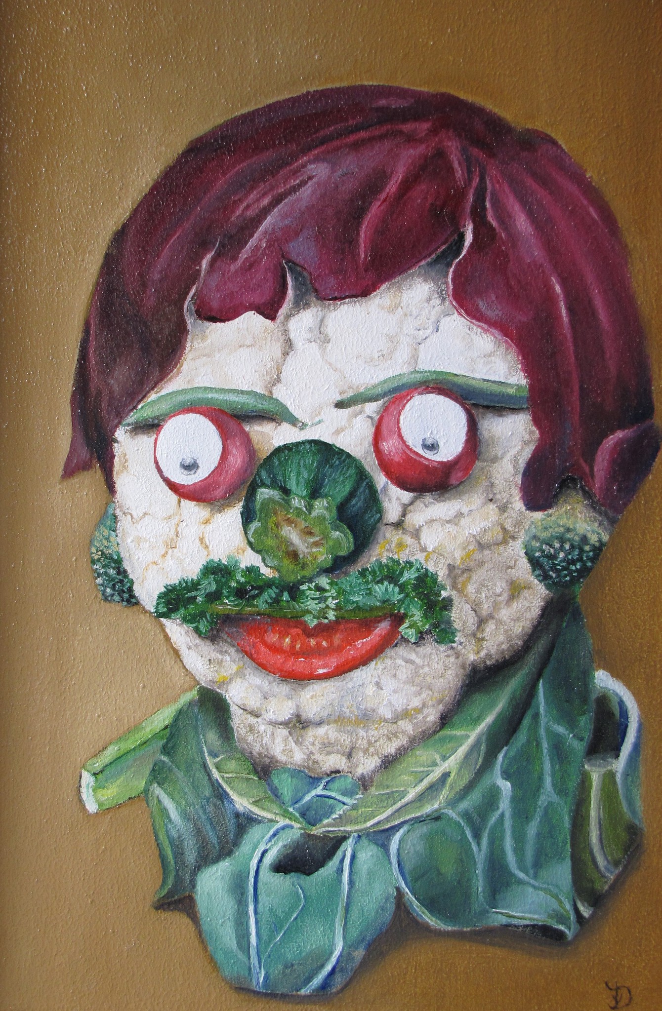 Samengesteld portret van bloemkool, rode kool en andere groenten; geïnspireerd op de schilderijen van Arcimboldo.