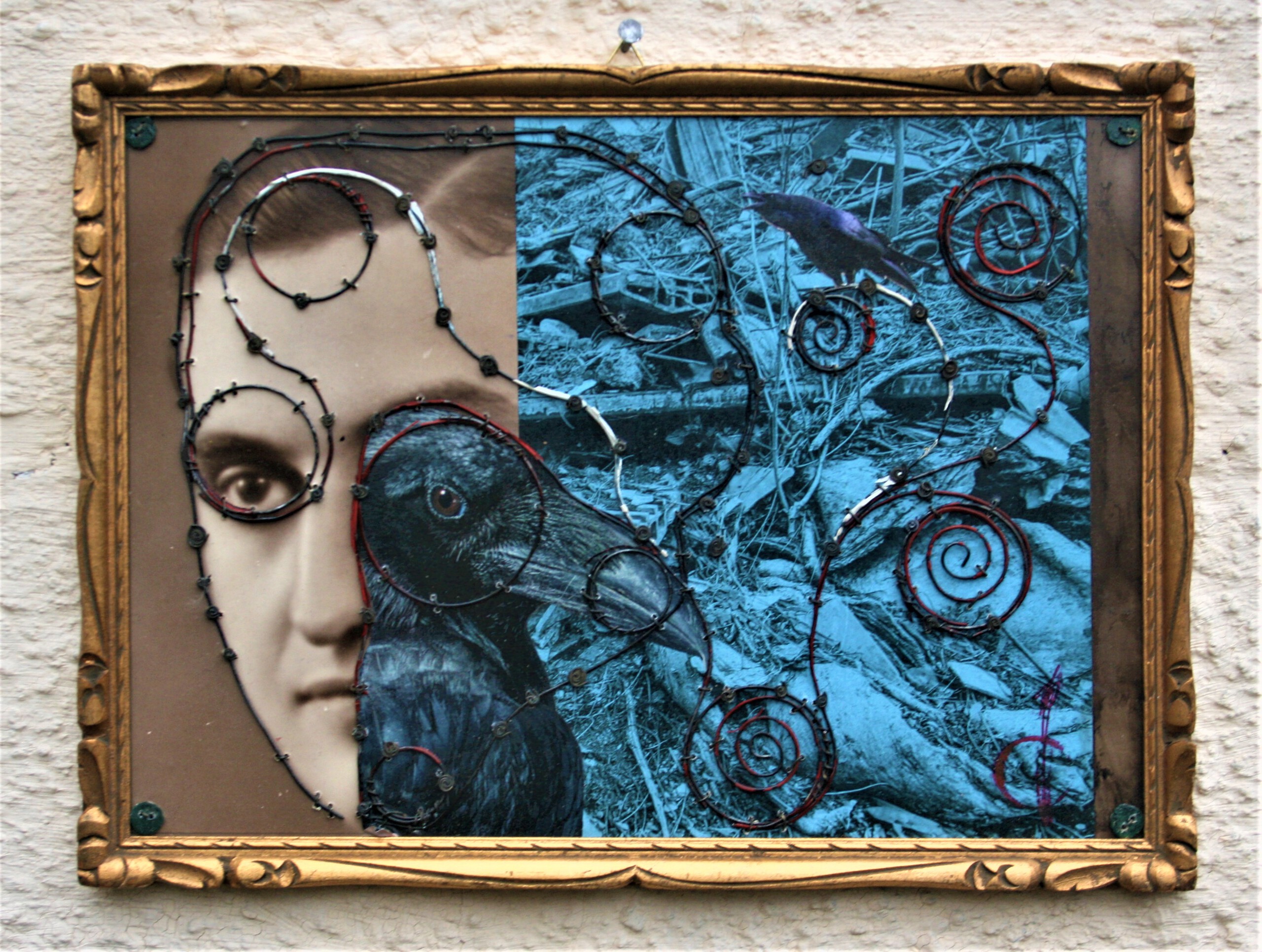 Antieke foto in originele lijst, bewerkt, ijzerdraad, acryl, collage
