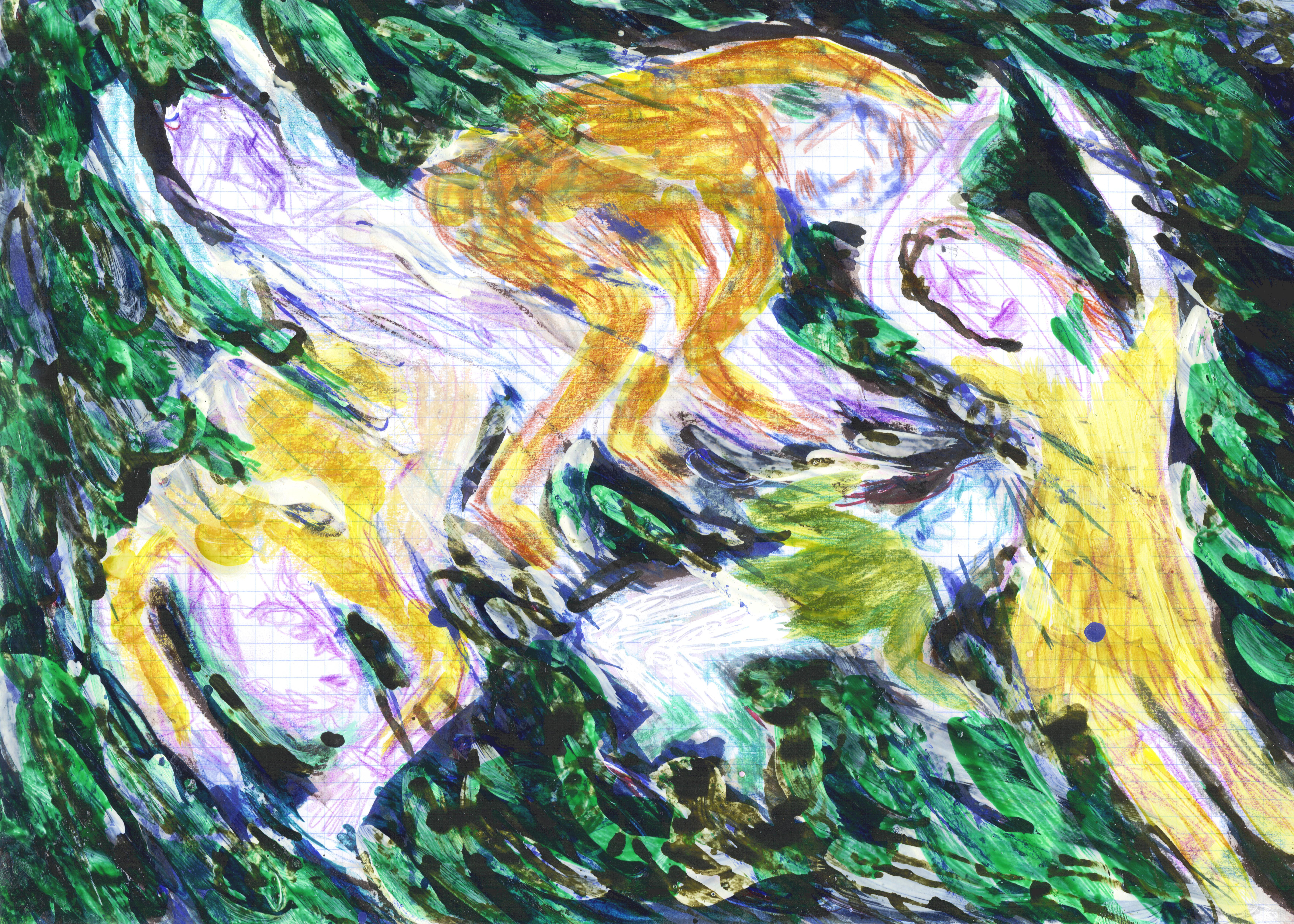 alles wegspoelend water, metafoor voor de nietigheid van de mens: `into this world we're thrown' (zeer gemengde techniek op papier)