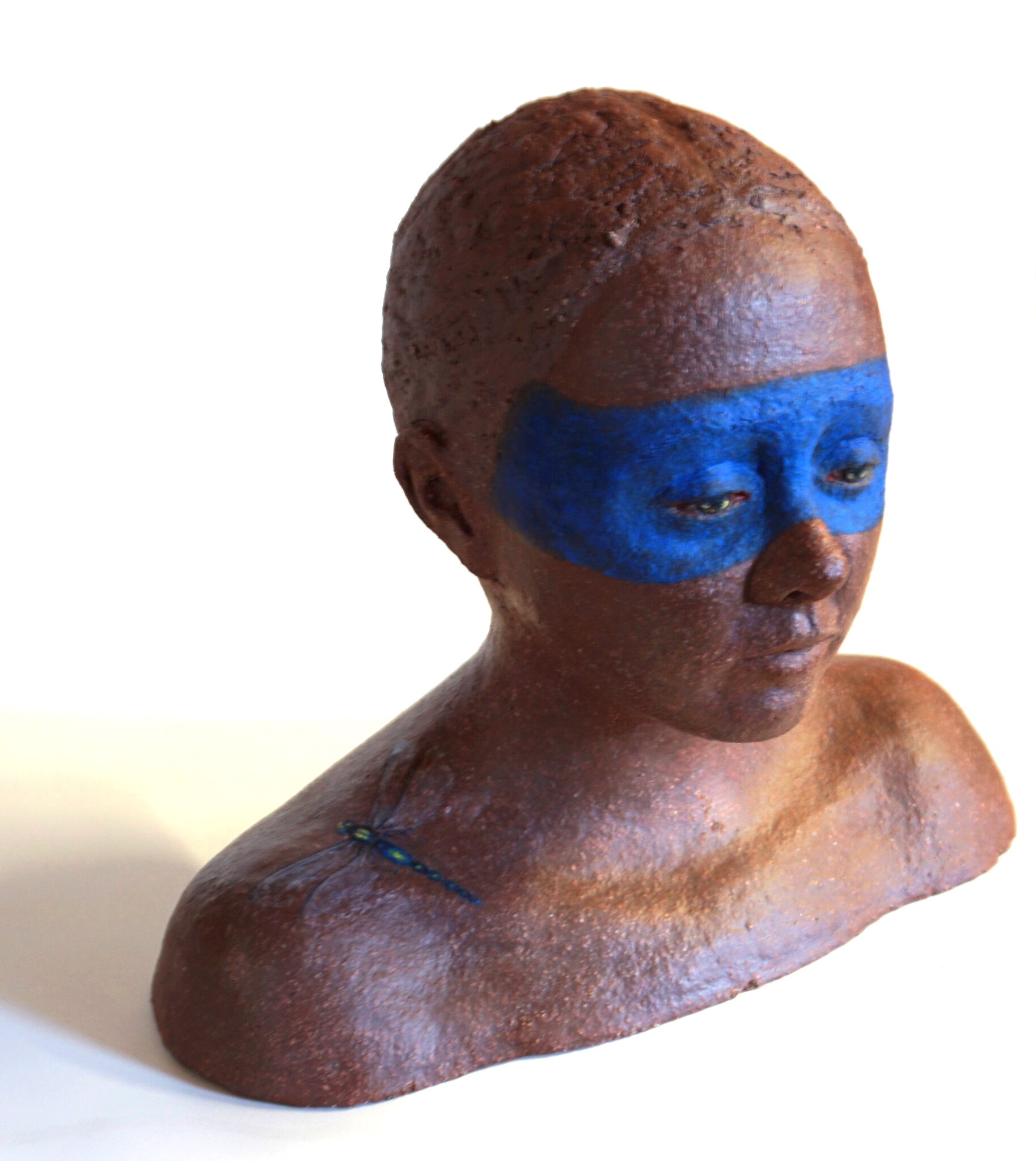 keramisch beeld met grove klei en libelle op de schouder.