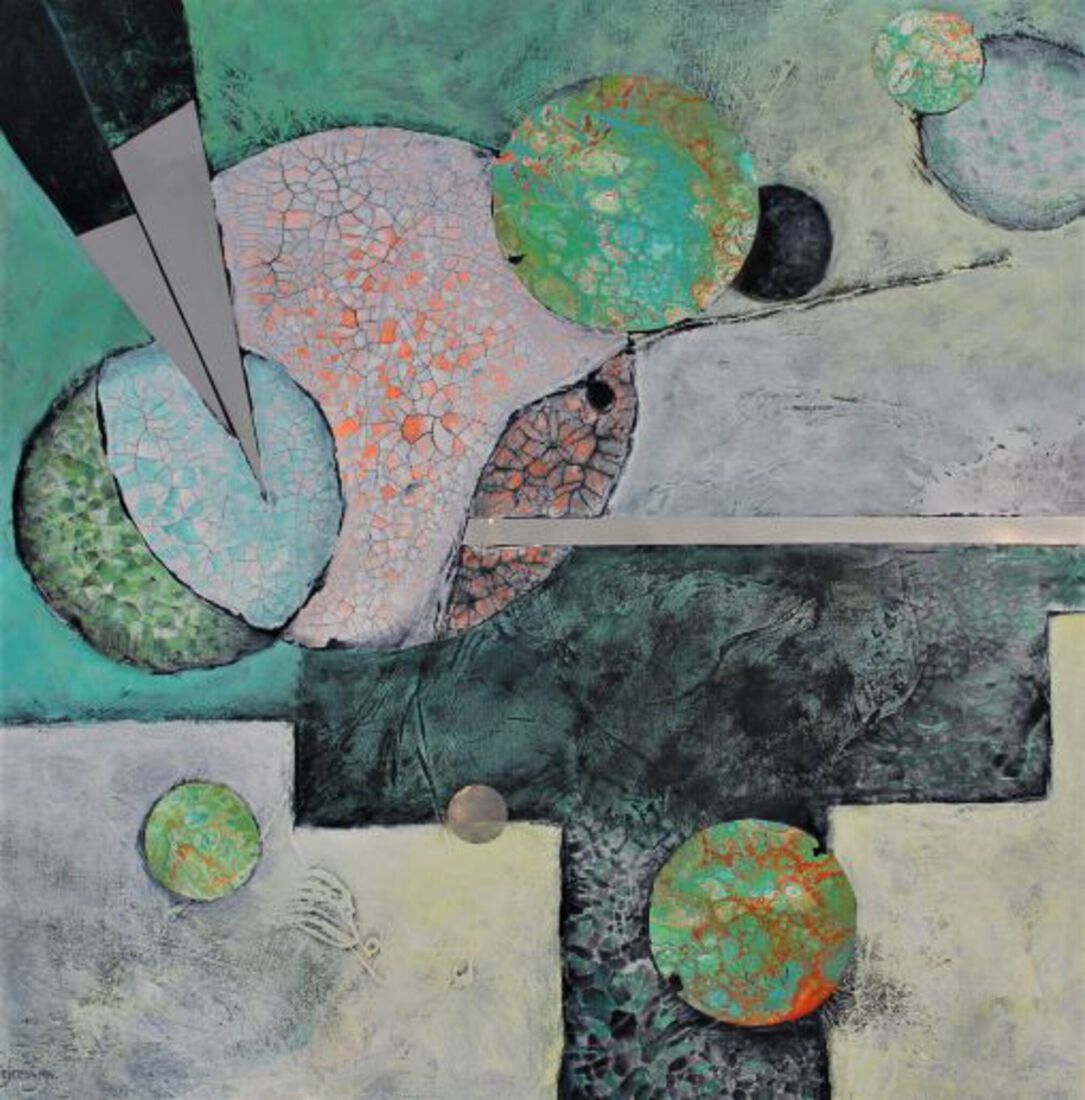 Schilderij in acryl op doek met elementen in RCS en metaal, met baklijst
