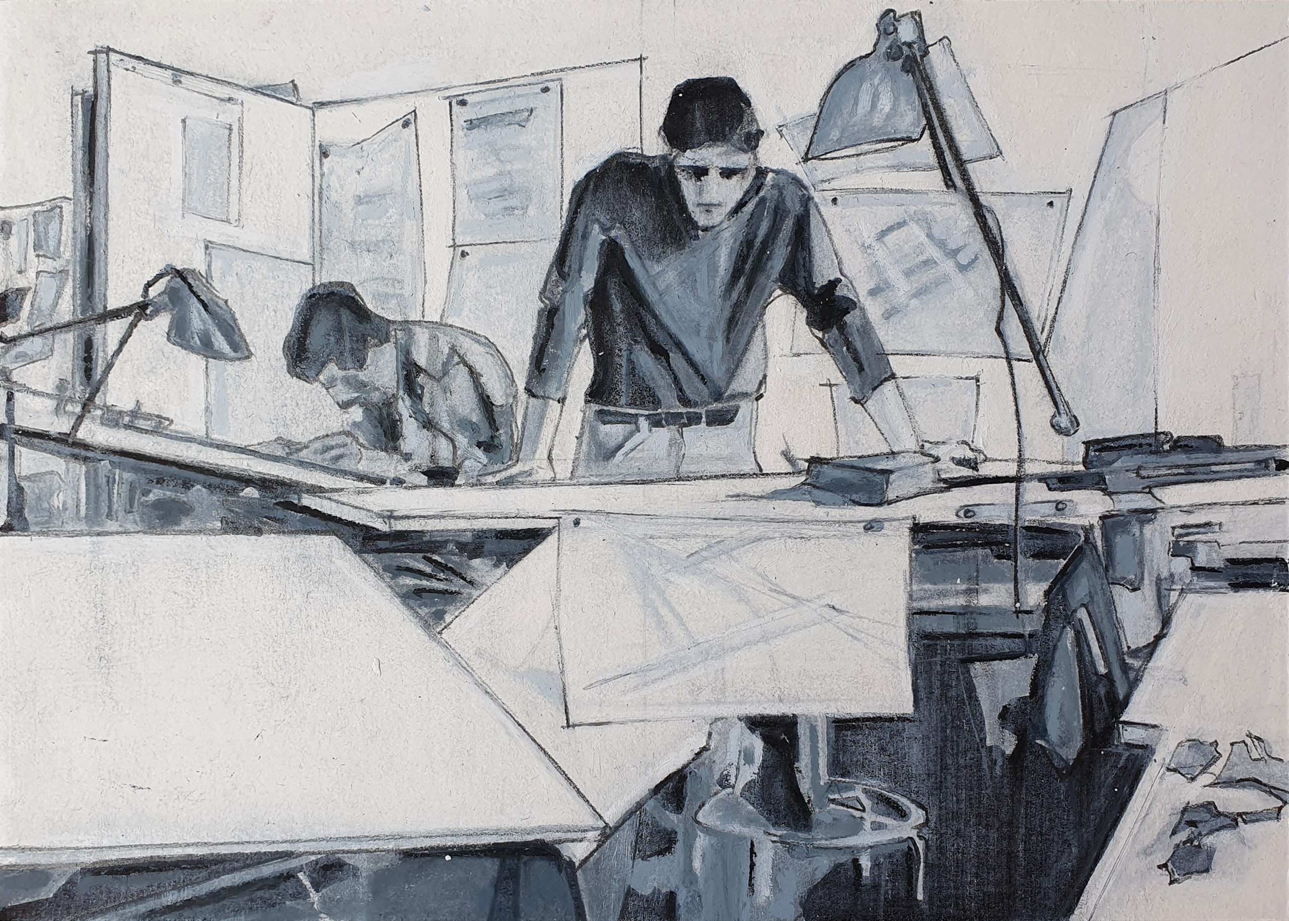 Uit de serie the powers that be. Optimistische architectuurstudenten in een omgeving en een wereld die er niet meer is. Gebaseerd op een filmstill uit een film over de favoriete gebouwen van Max Risselada.