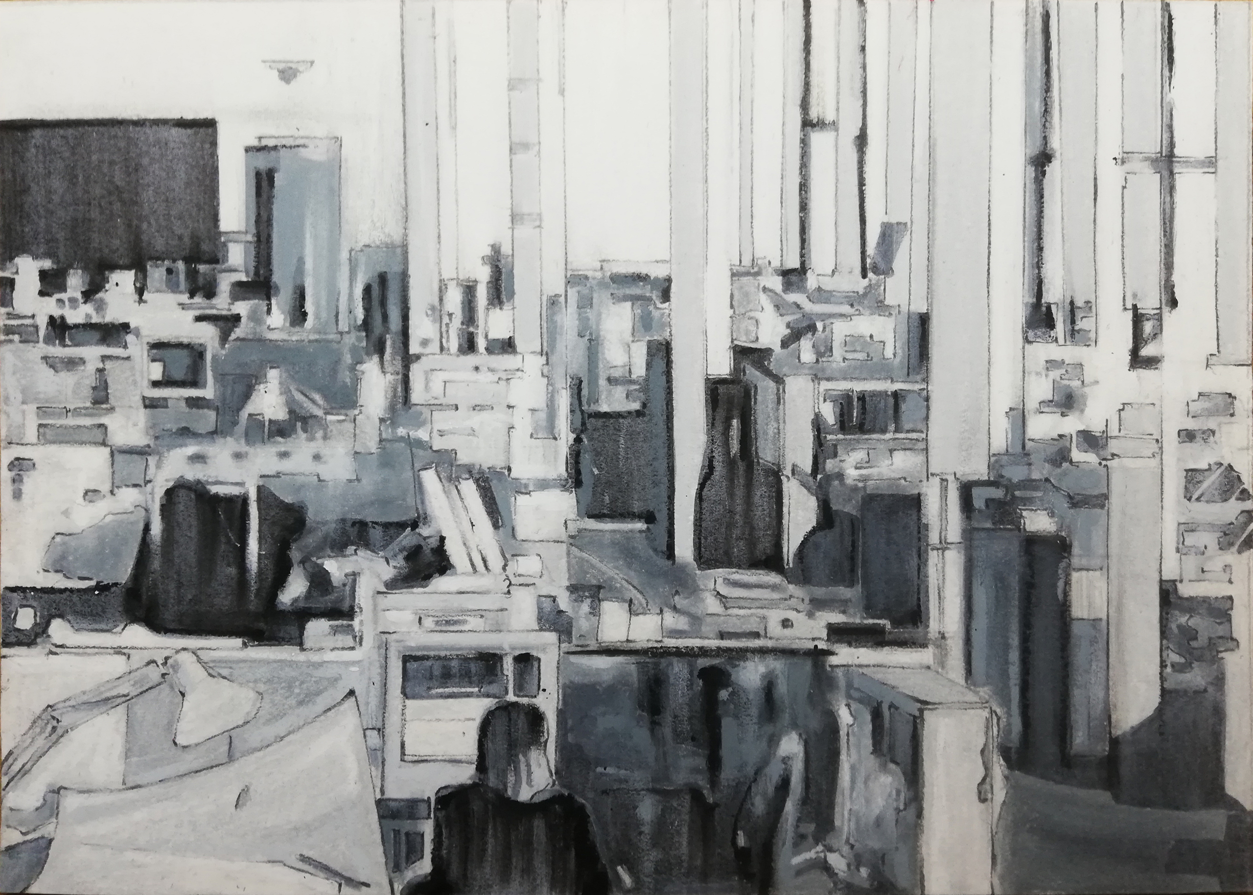 Het beelden werk van Martijn Huting, tekeningen, oliepastels, collages en polaroids, zweeft tussen abstract en figuratief, tussen droom en werkelijkheid, tussen heden en verleden, tussen feit en fictie. Voortkomend uit de architectuur, verwijzend naar de (kunst) geschiedenis, de literatuur en zichzelf, wordt een complex van betekenissen en verhalen ontwikkeld, waarin de tekeningen en oliepastels fungeren als uitvergrote momenten, om later weer in het verhaal te worden opgenomen.