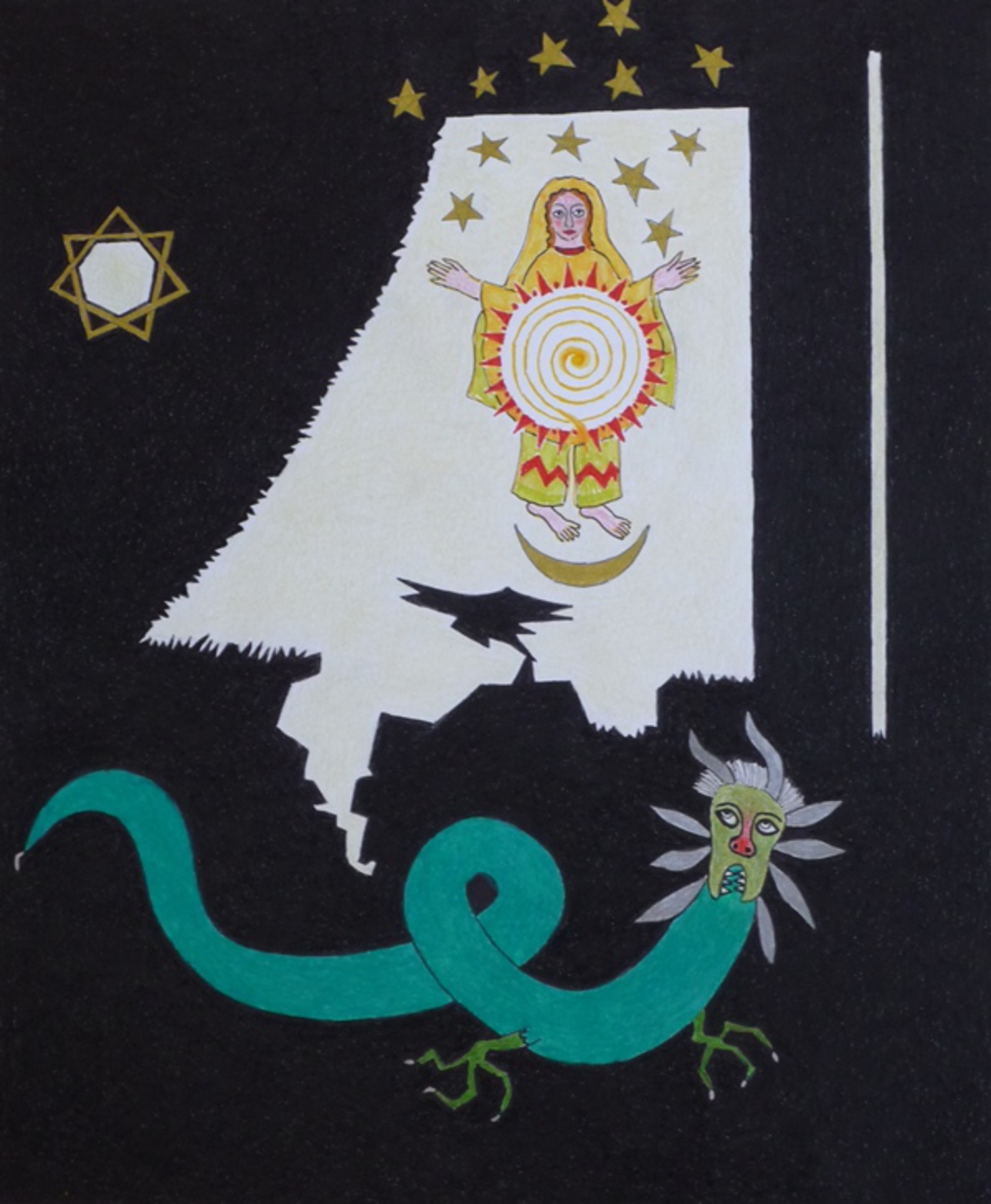 abstracte compositie met figuur maan sterren en draak.