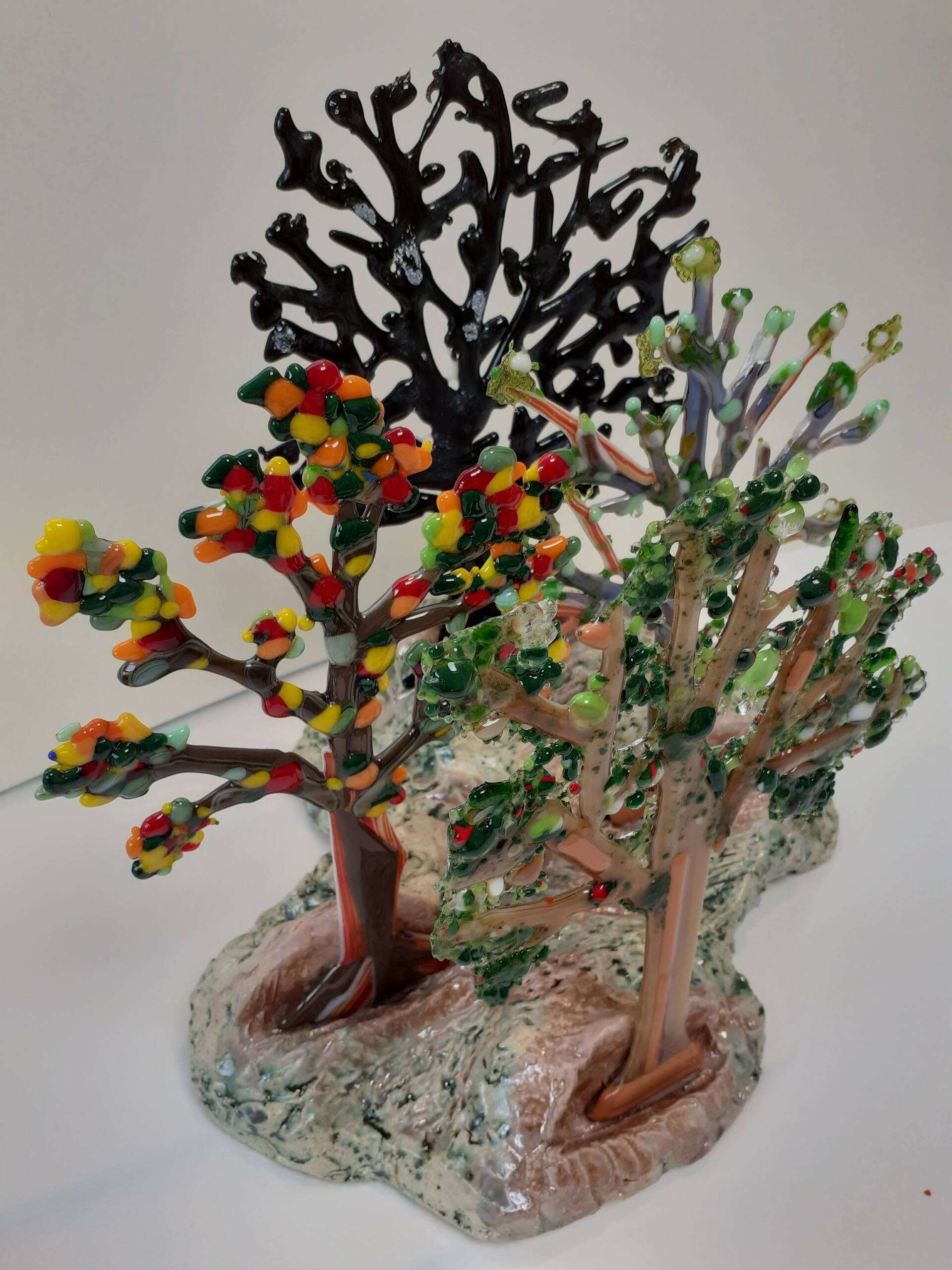 Een vrolijke samenstelling van 4 bomen in de 4 seizoenen. De bomen zijn gemaakt van vooral 96 glas, en de winterboom van gerecycled glas. Alle bomen zijn gemonteerd op een heuvel van geglazuurd keramiek.