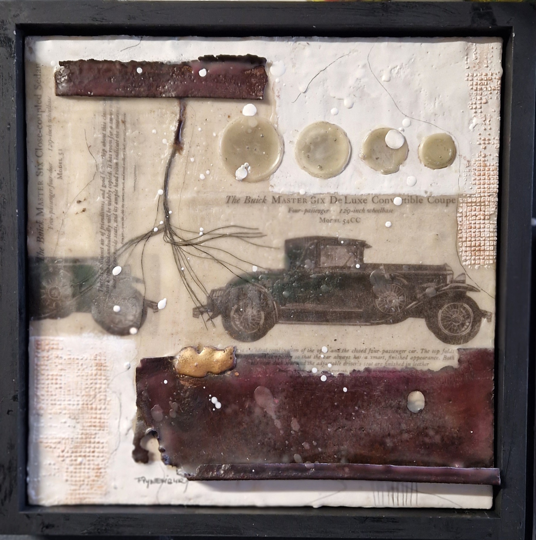 Encaustic, bijenwas, op hout, oud roest, ijzer, een ode aan de oude Buick