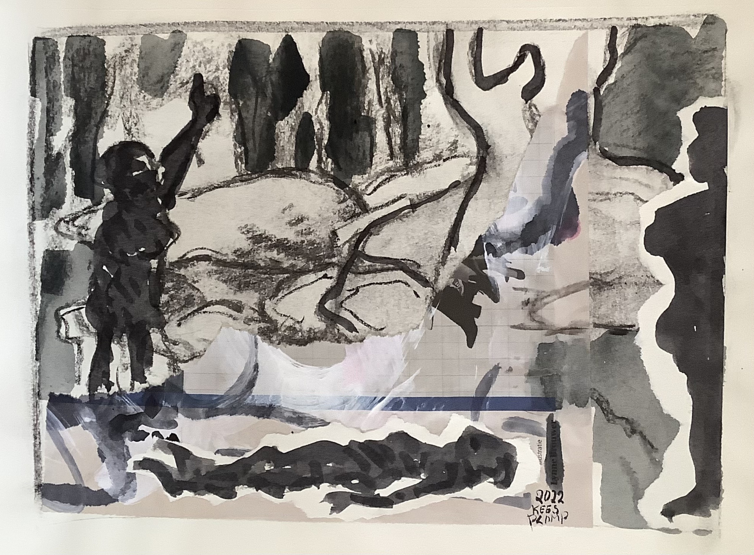Penseltekening met inkt gecombineerd met collage.