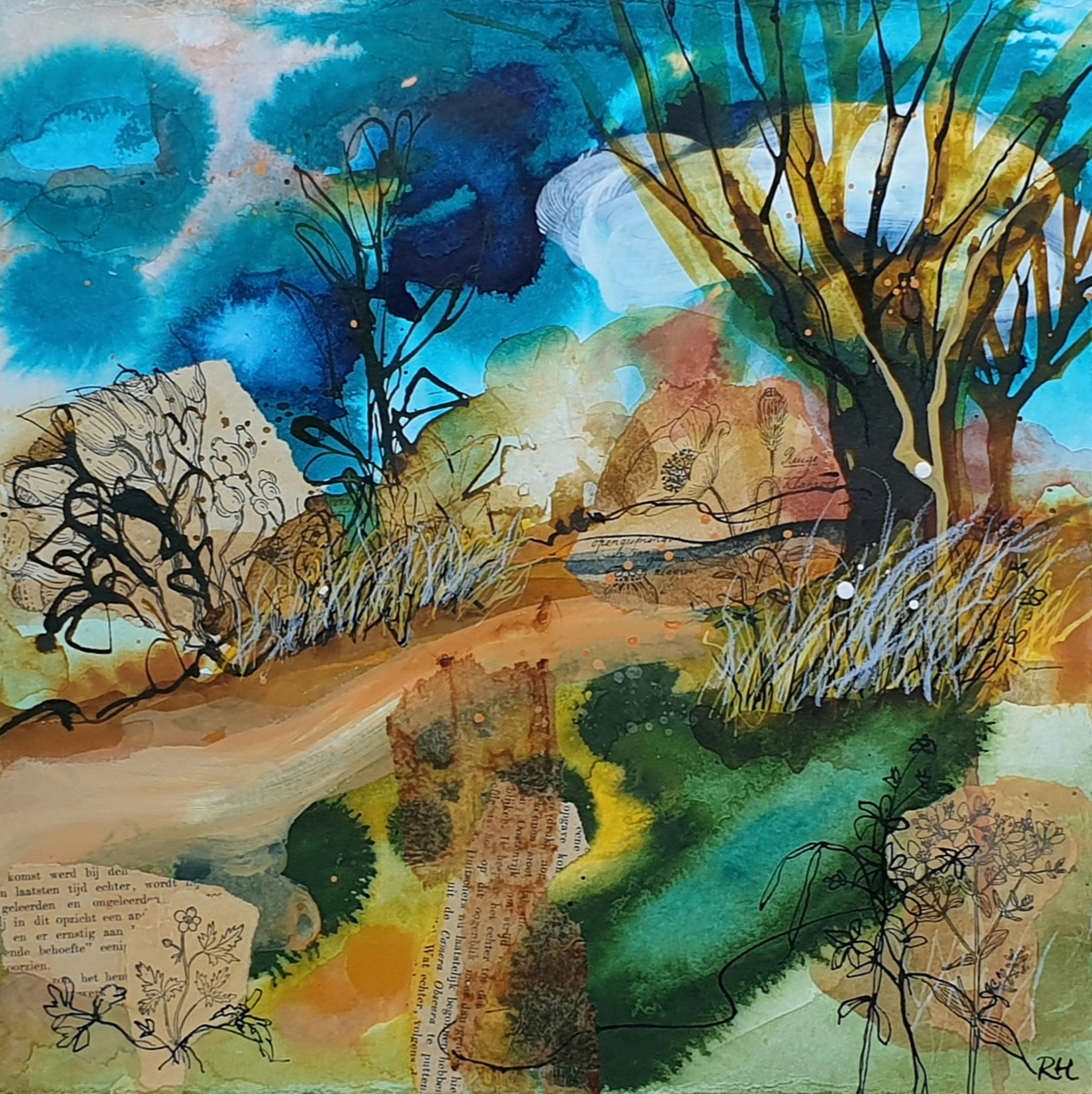 Blauw Bomen Mixed Media Landschap Natuur Papier Schilderij