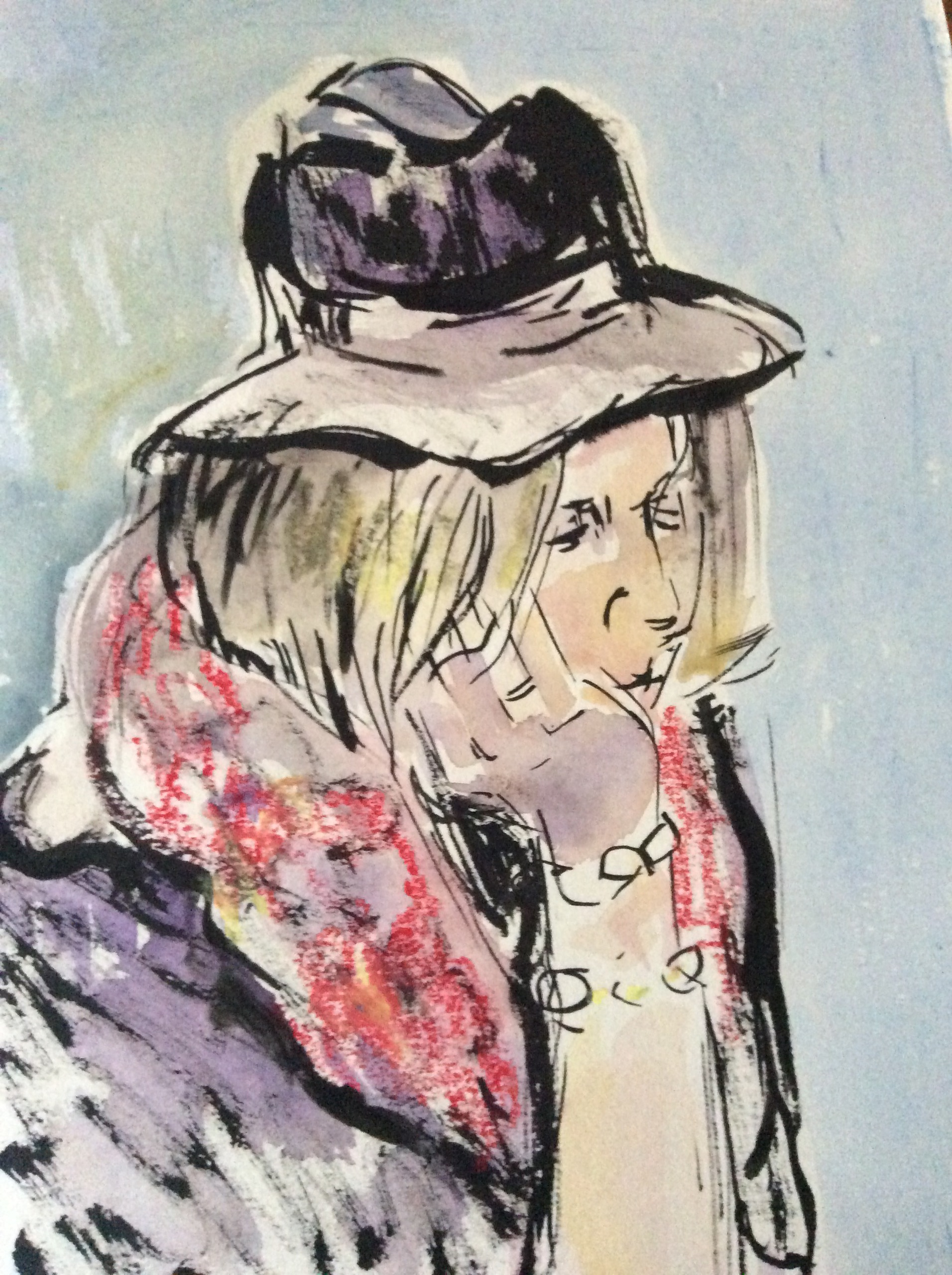 Vrouw met hoed, aquarel en inkt met oliekrijt