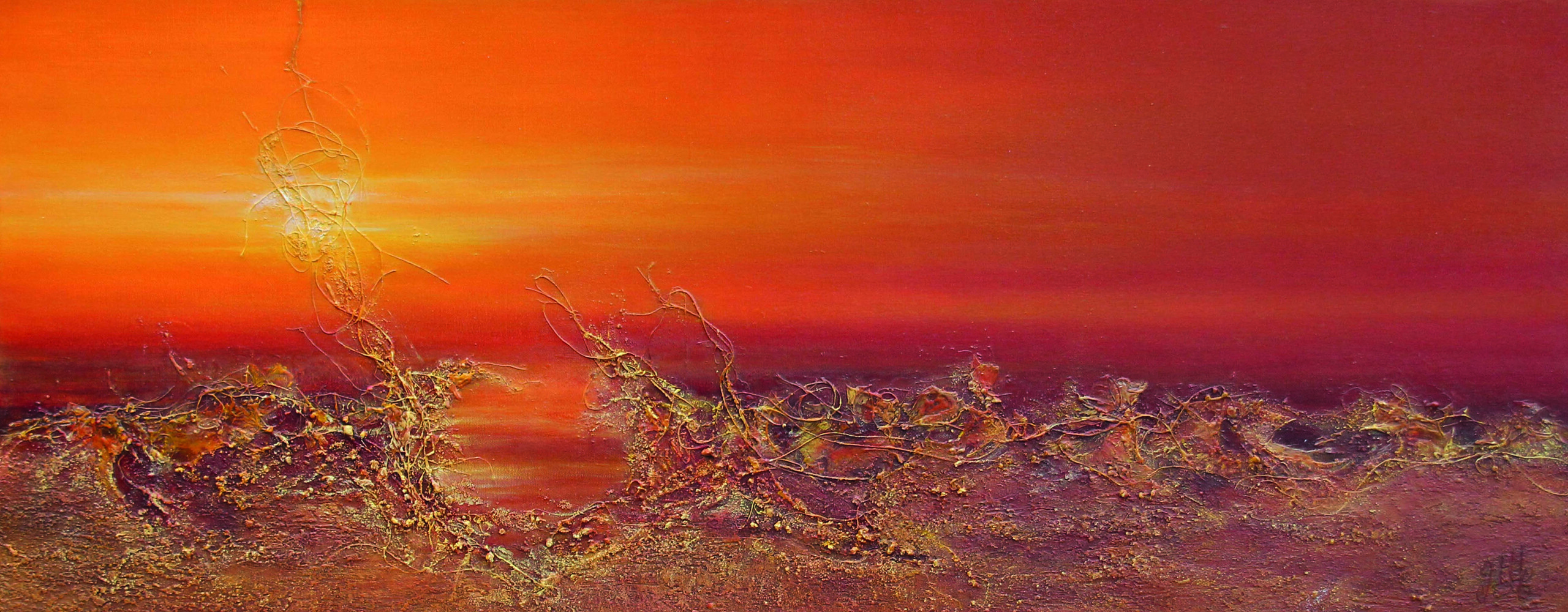 Oneindig mijmeren bij zonsondergang over de lagune. Mixed media acryl.
