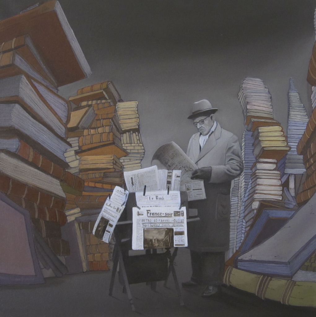 De hoofdfiguur kijkt gefascineerd in zijn krant en we kunnen zelfs enkele hoofdtitels onderscheiden op de andere kanten waarnemen waarover het precies gaat. Dit gegeven is niet zo belangrijk. De vele boeken die torenhoog zijn gestapeld en met lederen kaften zijn omgeven, gebonden en soms een beetje haveloos zijn veel belangrijker. Het geheel staat dwars op het digitale tijdperk en vormt daarmee een soort van artefact op die vooruitgang. Het subtiel kleurgebruik dat voornamelijk op de boeken rust legt nog een extra accent op dit gegeven.