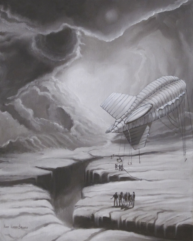 Het cataclysme of de ondergang van onze wereld is een gegeven dat al eeuwen meegaat. Zoveel is duidelijk, de lucht is dreigend en in een gigantische beroering. Het landschap is op enkele miniscule figuurtjes na desolaat. Enkel de zeppelin ballon vult een groot deel van de ruimte en is een vaartuig dat die figuurtjes manipuleren. Het is duidelijk dat het hun vluchtmiddel zal worden maar even lijkt het alsof ze het niet in balans krijgen. Hier wordt op de sepiatinten na geen kleur gebruikt. Het geheel doet denken aan de oude gravures die Jules Verne zijn verhalen illustreerden. Jawel een beetje science fiction maar met de opwarming van de aarde ook misschien toekomstmuziek.
