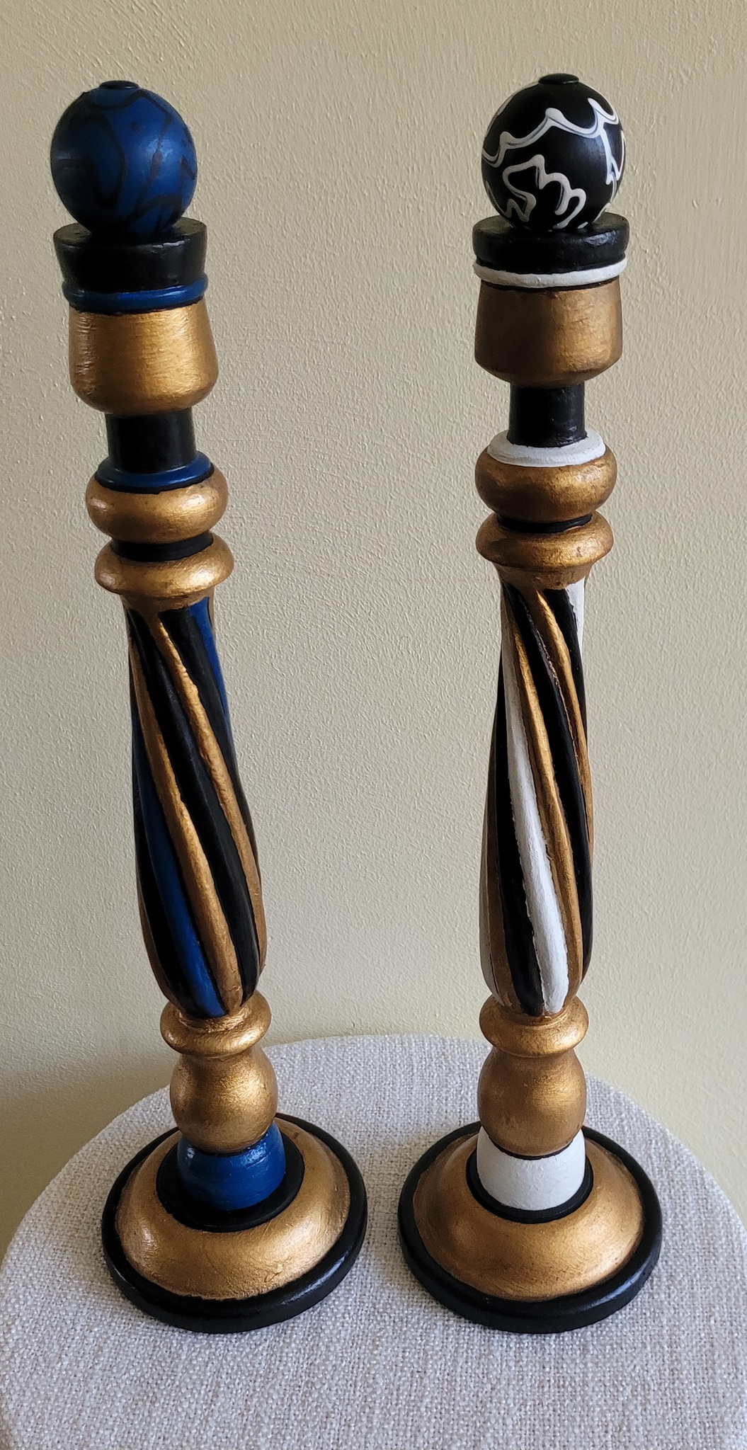 Twee identieke kandelaars, complimentair geverfd.