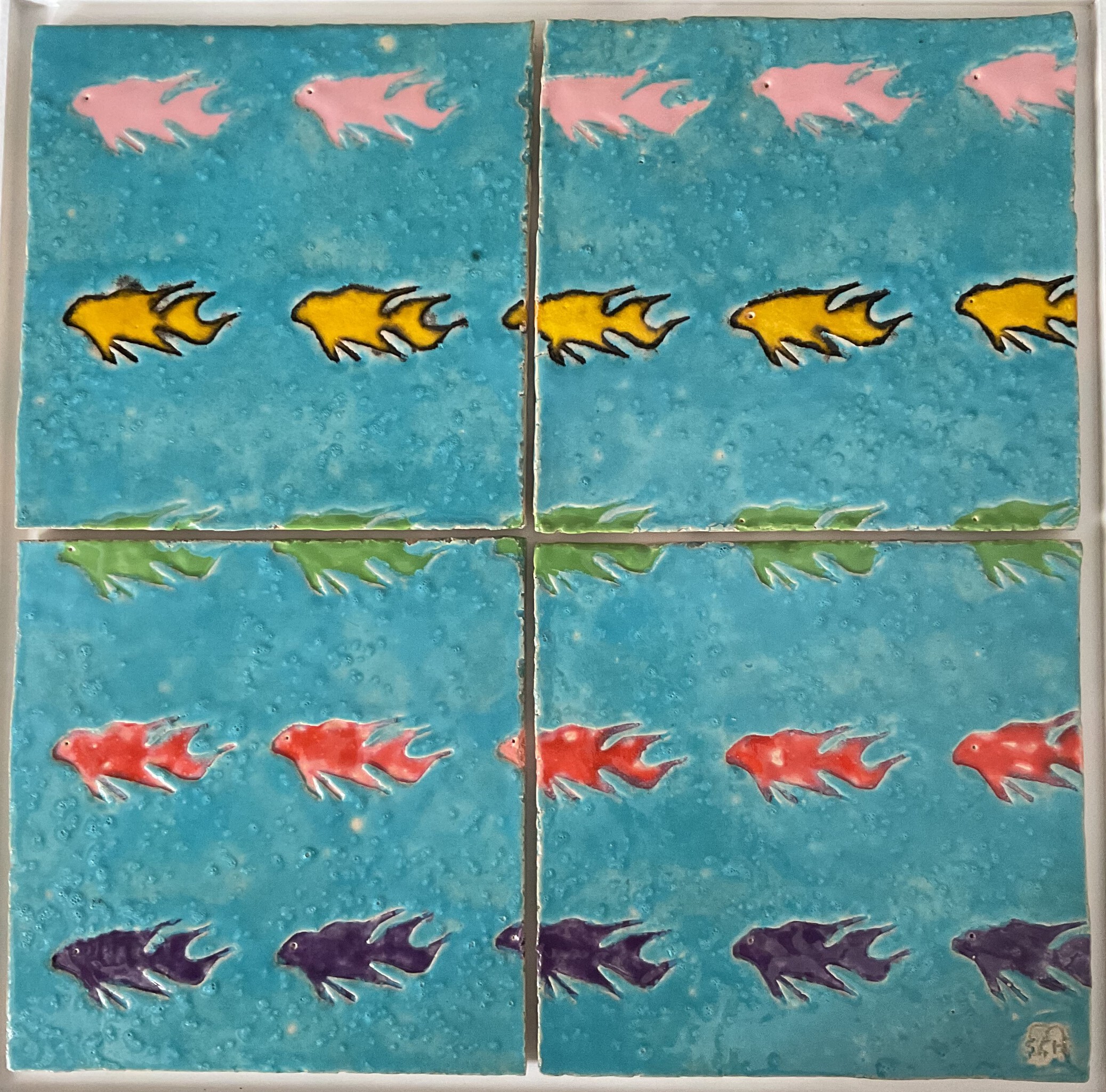 Soms is een sculptuur niet wat je zoekt, soms mag het gewoon plat zijn. Met een partner die schildert (Erik Blok) is er soms toch de neiging om ook een schilderij te maken. Dit is er een van de twee die ik dit voorjaar heb gemaakt. Dit keramiekschilderij is ingelijst in een houten, witgeschilderd, frame.