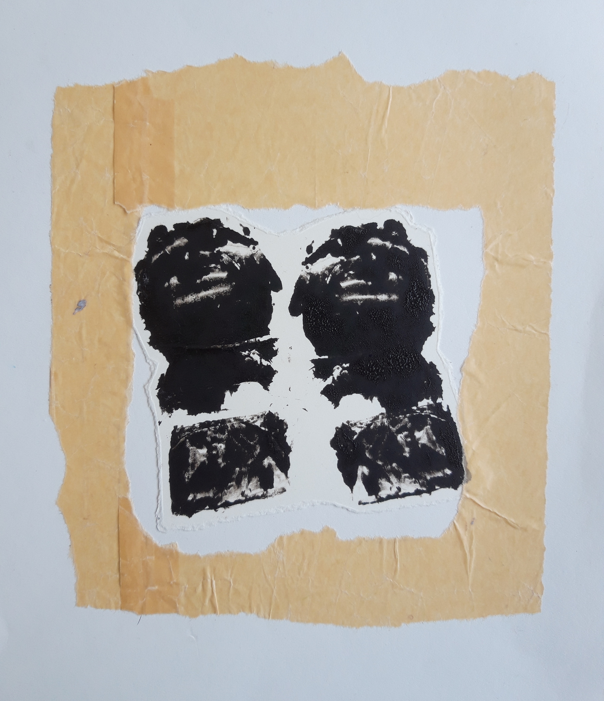 Een dialoog zonder woorden / met adem ingehouden, zelfs / / het enige geluid geproduceerd / door de pers gebruikt voor het drukken. (monoprint)