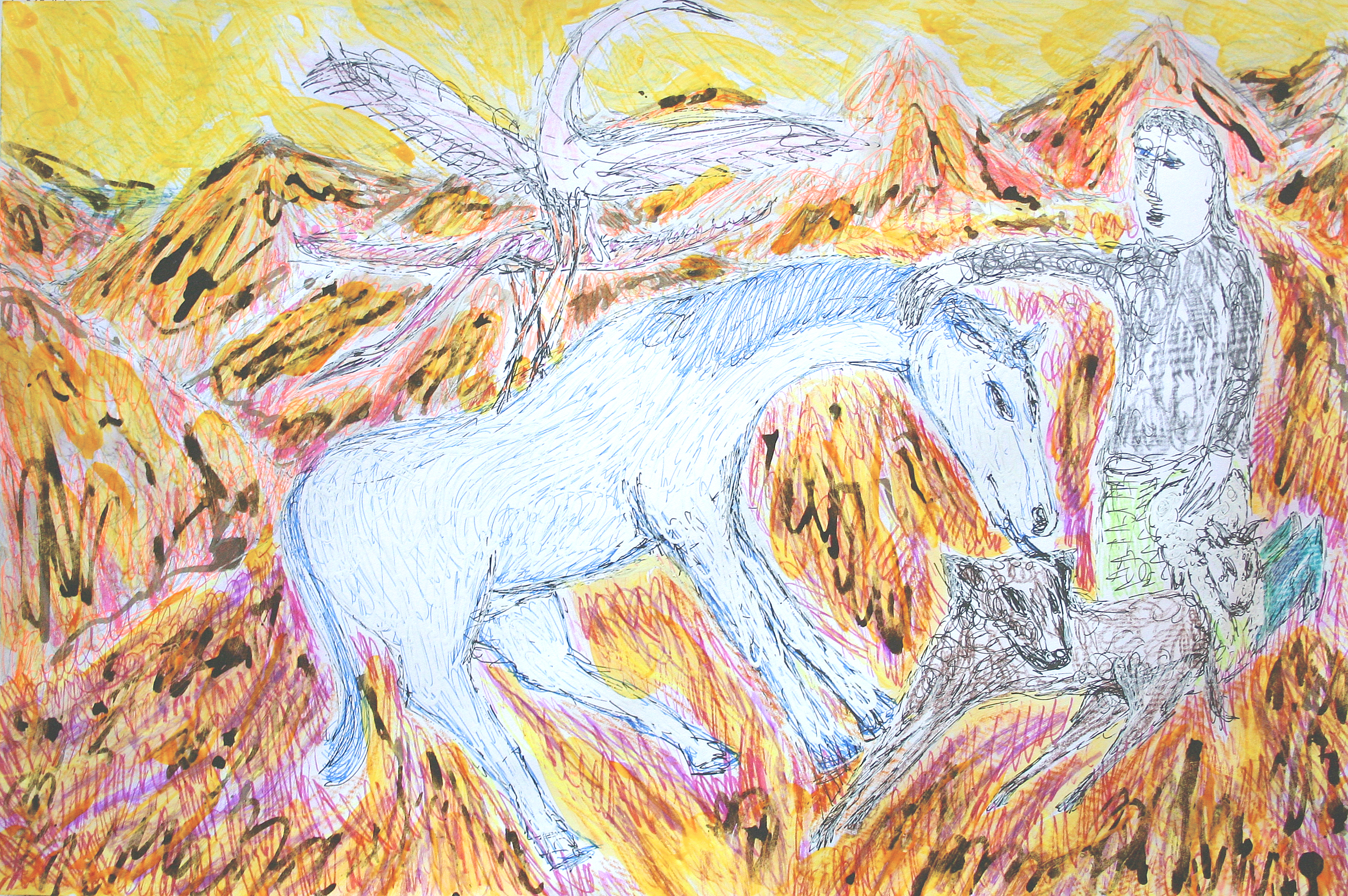 dieren kwamen tot hem... (franciscus van assisi, 1182-1226) zeer gemengde techniek op papier.