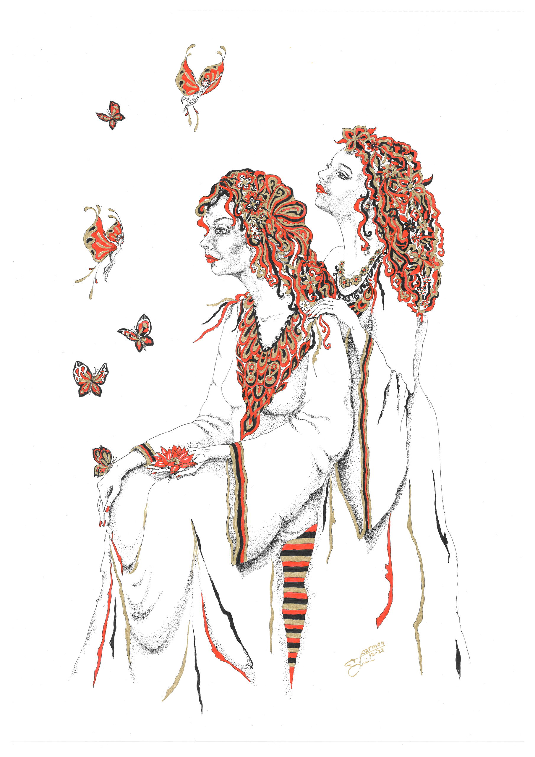 Deze pentekening is geïnspireerd door de natuur, sprookjes en vrouwelijkheid. De kleuren rood, zwart en goud, afkomstig uit de traditionele Roemeense nationale klederdracht, komen terug in alle 22 tentoongestelde werken (nu bij StEK in Ermelo galerie tot 1 april 2023).