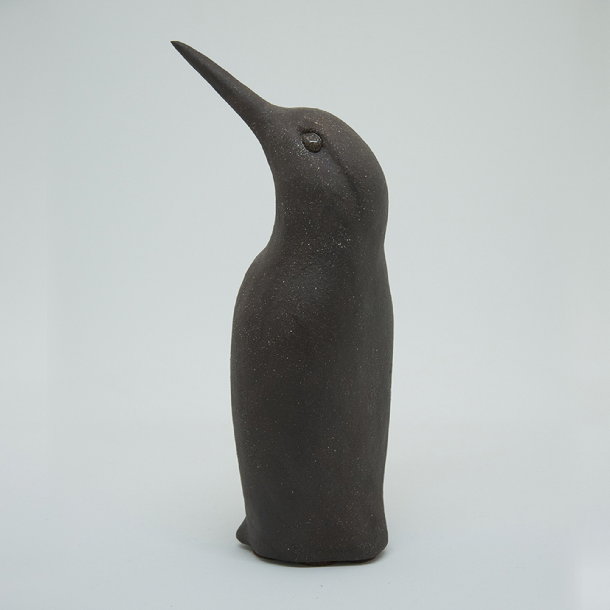 IJsvogel gaat in paalhouding zitten bij gevaar. Zwarte klei. Ogen transparant glazuur.