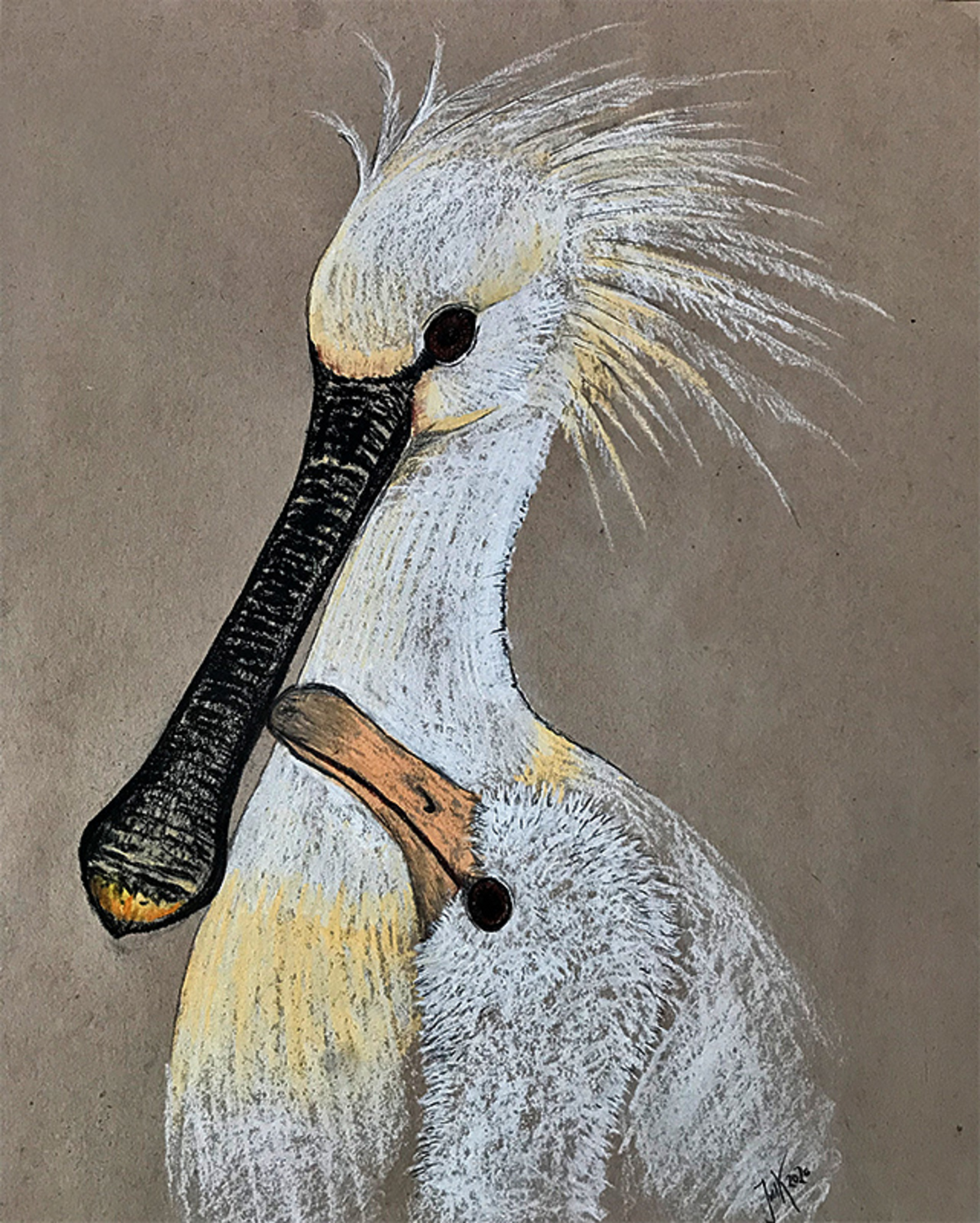 Lepelaar met jong. Conté à Paris Pastelkrijt op kraftpapier