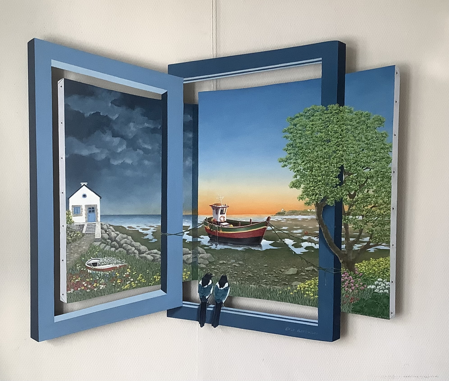 Eric Kerkvliet schildert met olieverf uiterst gedetailleerd voorstellingen op iets verhoogd paneel waardoor bij juiste belichting een Trompe-l’oeil-achtig effect ontstaat.