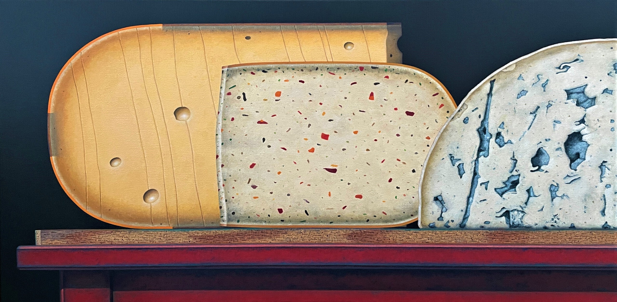Een olieverfschilderij met meerdere kazen.