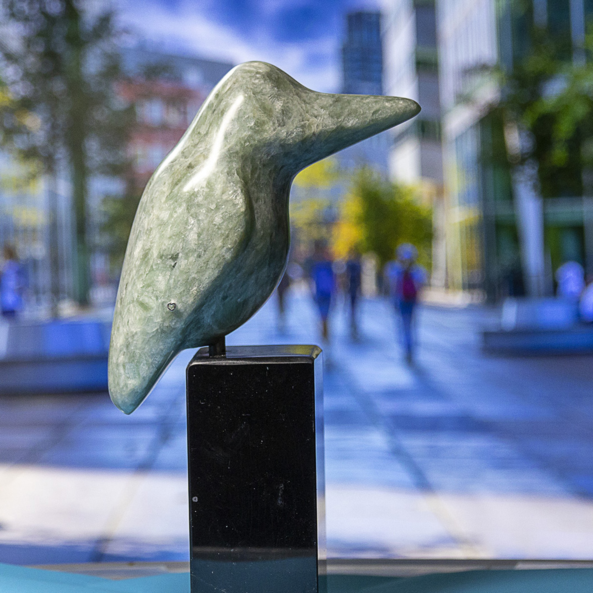 ijsvogeltje van turquoise India speksteen op zwart marmeren sokkeltje.