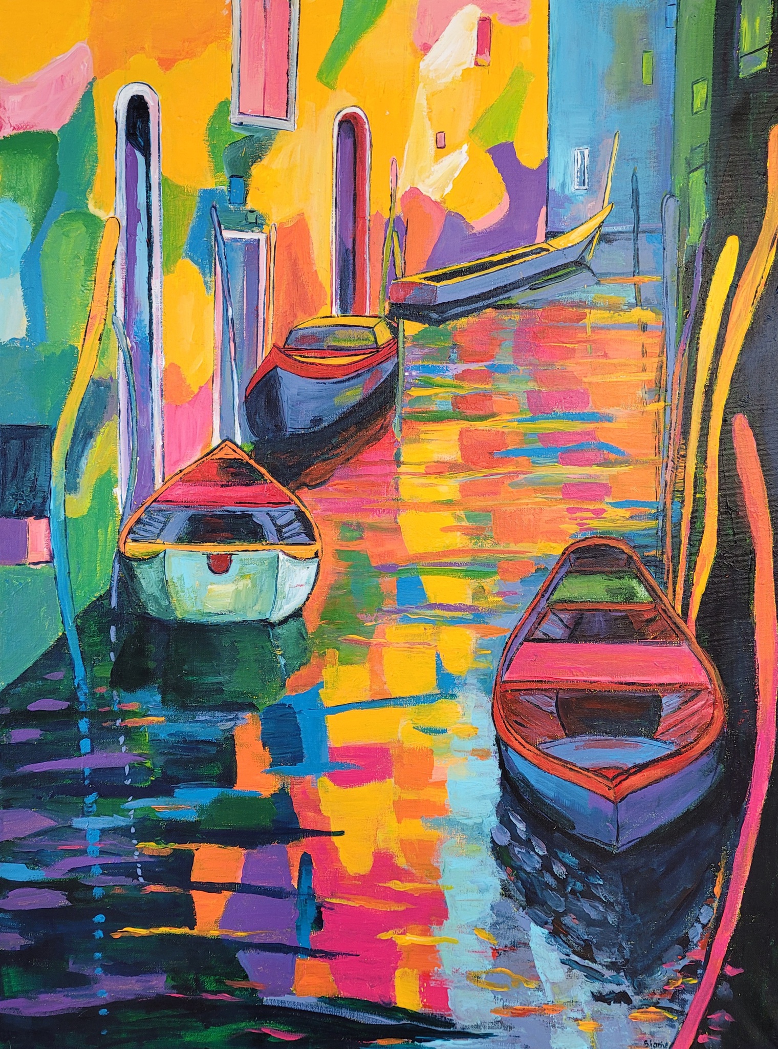 Een kleurig schilderij met bootjes. Geïnspireerd door Zanella.
