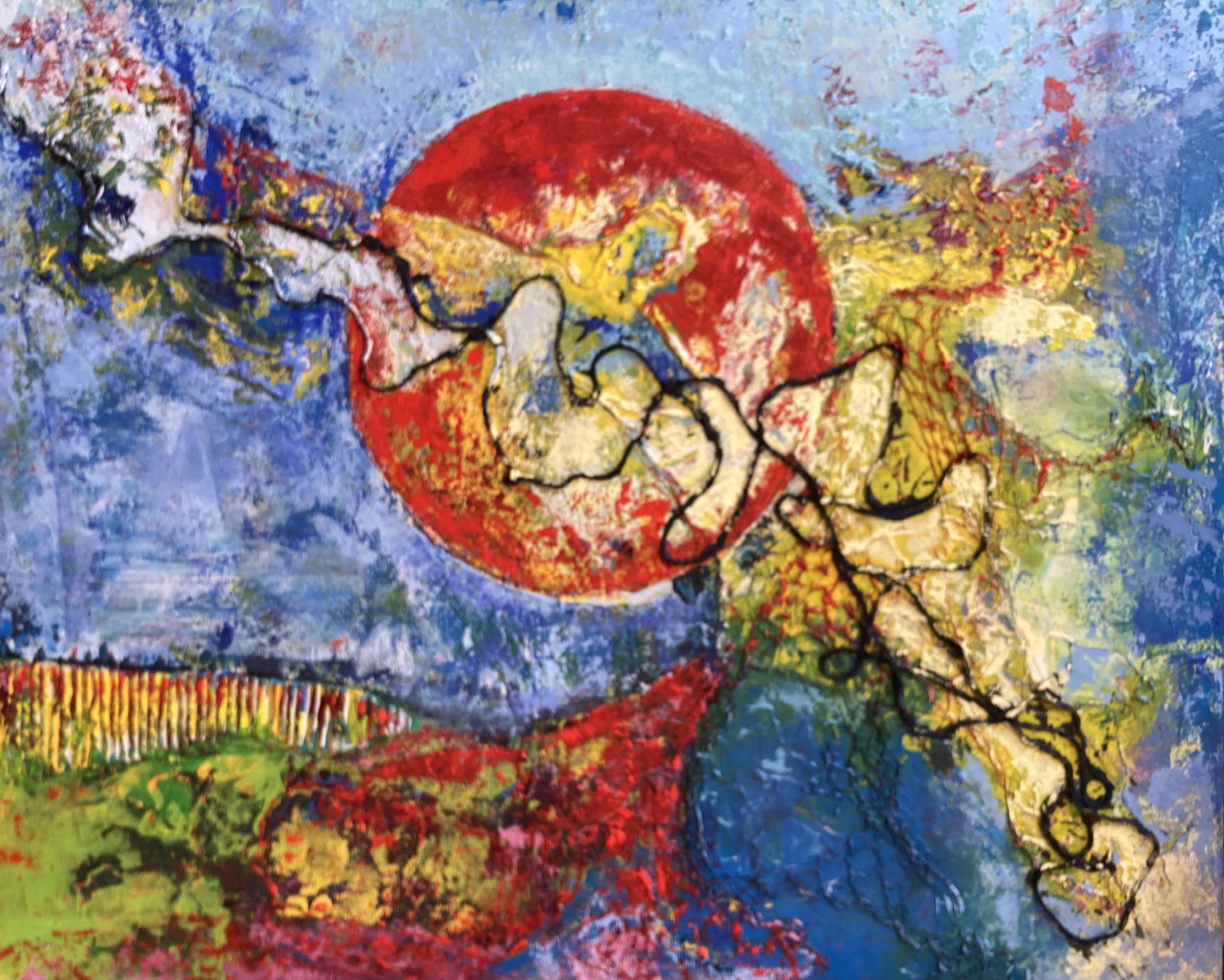 Schilderen met acryl en paletmes. Meeste schilderijen ontstaan vanuit innerlijk beeld, indruk of tekst.
