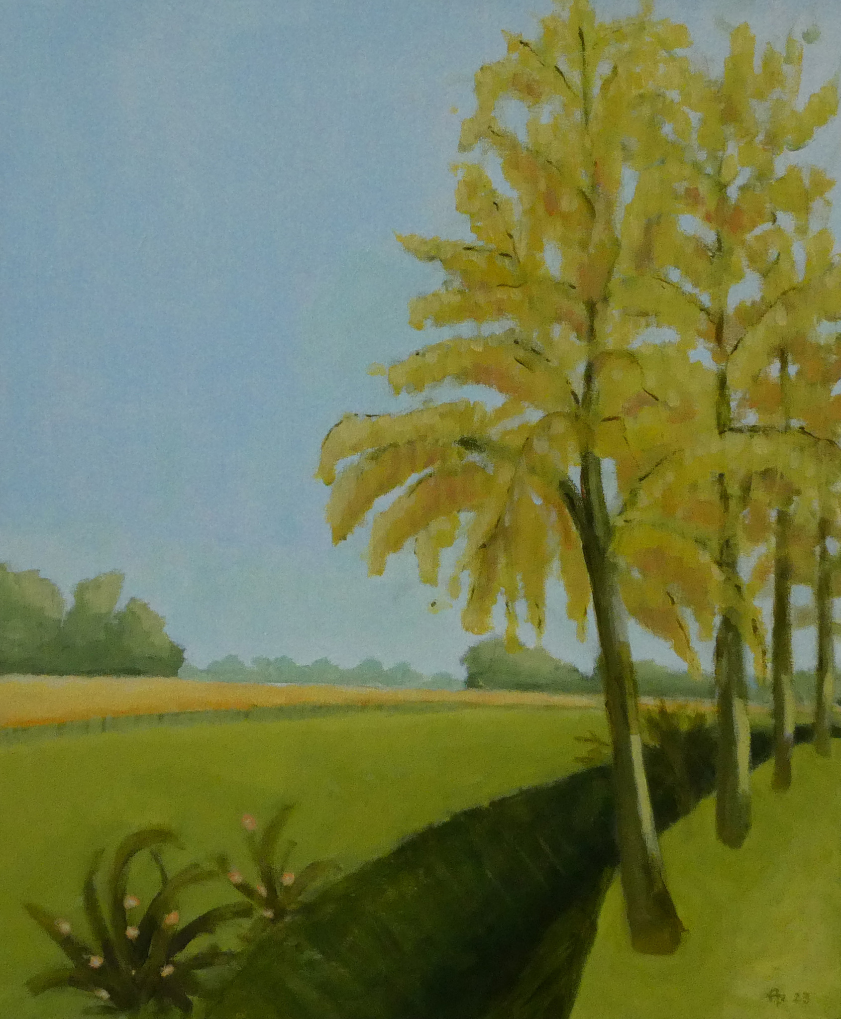 Zacht licht en zachte kleuren in de lente. Pril groen, geel en zacht blauw. Dit schilderij wordt ingelijst geleverd in een witte houten baklijst.