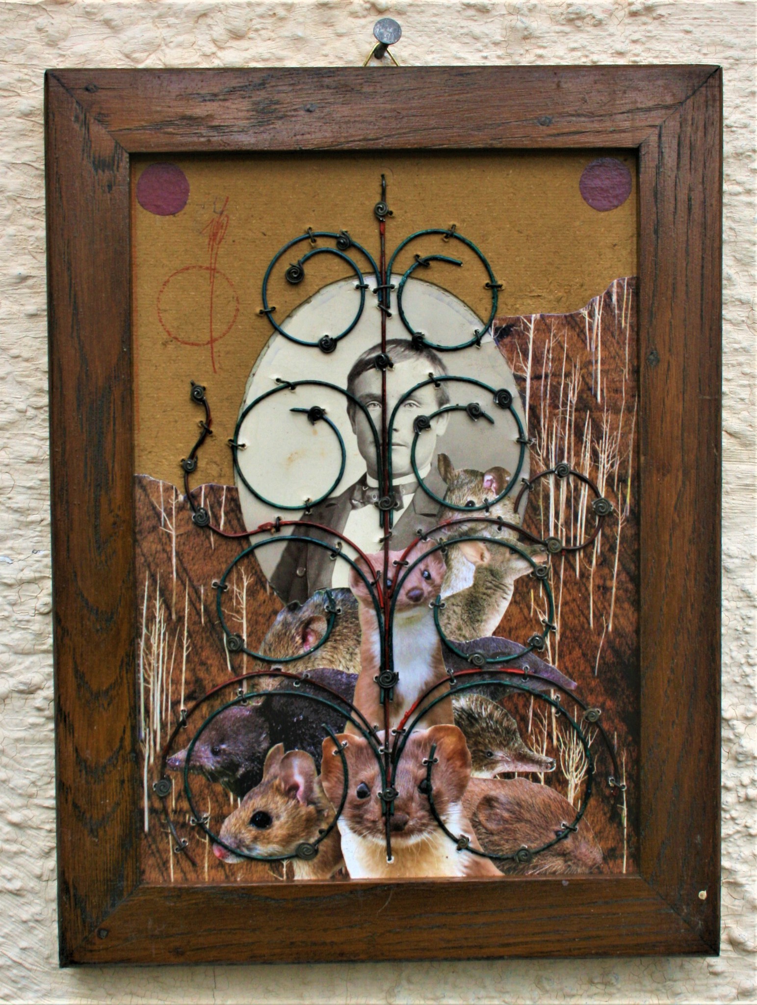 Antieke foto in originele lijst, bewerkt, ijzerdraad, acryl, collage