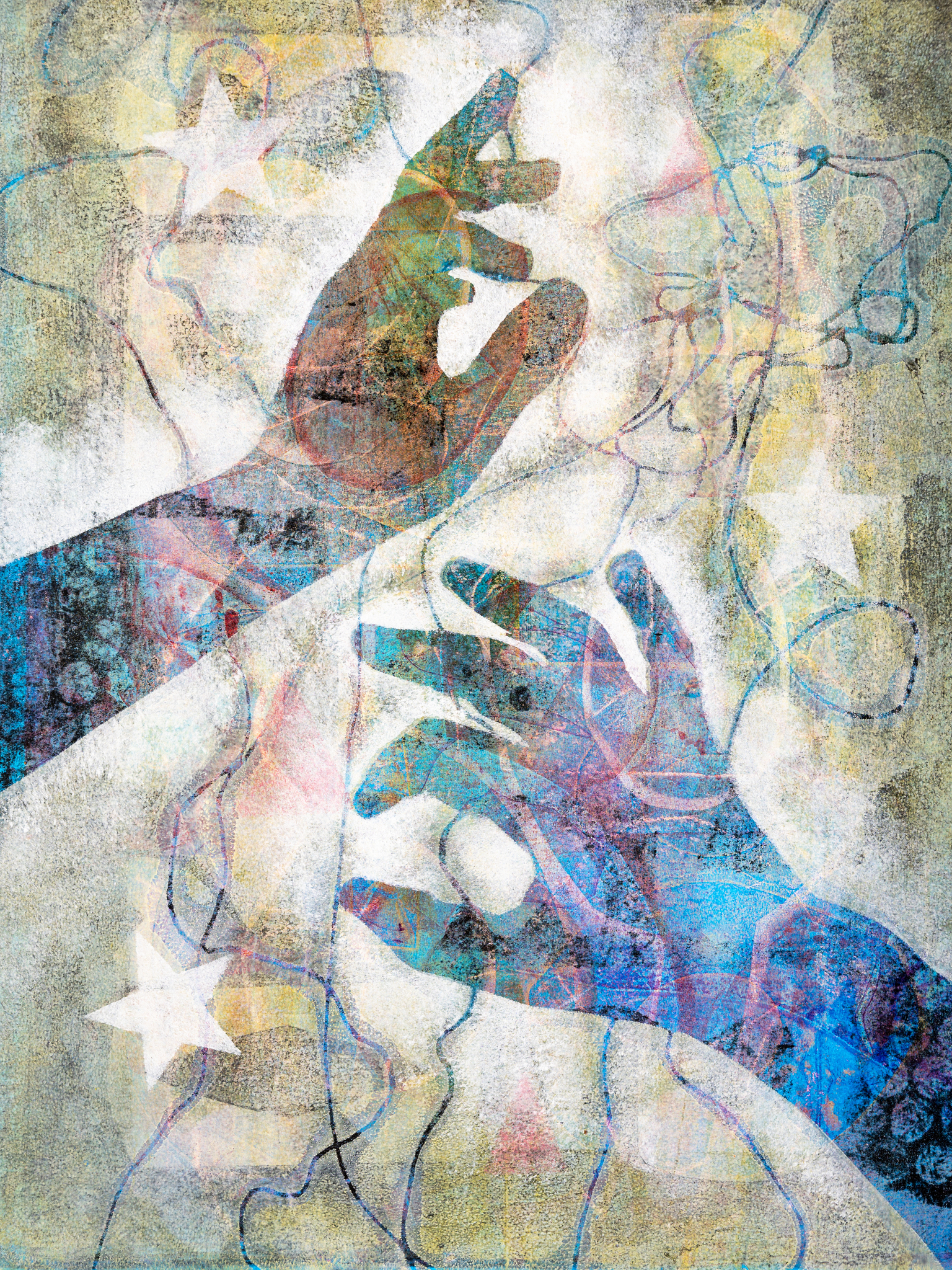 Monoprint Monotype Hand Handen Sterren Verbinden Betoveren Ontwarren Verbinding Betovering Ontknoping