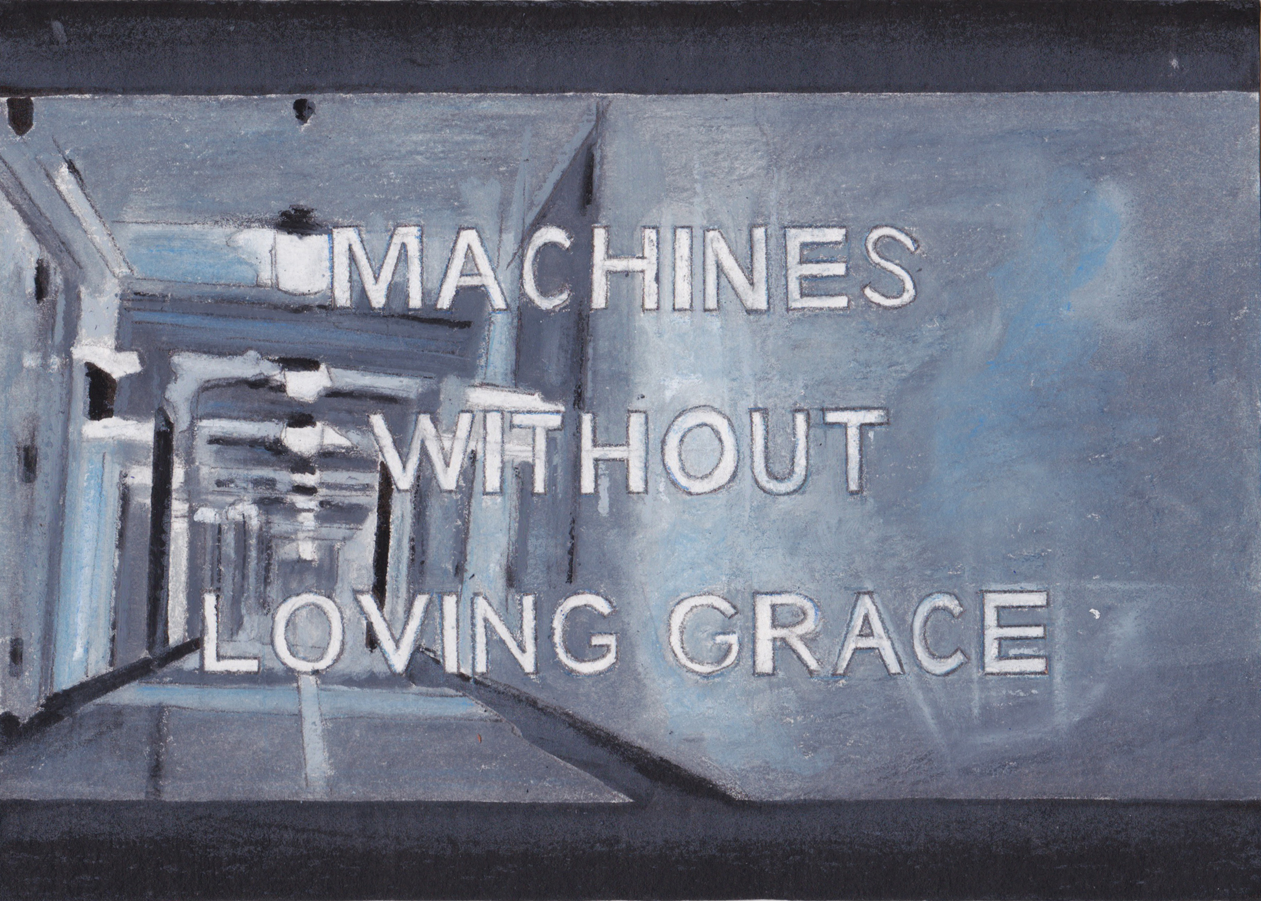 Een gang. Beeld en titel gebaseerd op een film-still uit de BBC documentaire "All watched over by machines of loving grace" van de Britse documentairemaker Adam Curtis, waarin hij stelt dat machines gefaald hebben de mensheid te bevrijden en in plaats daarvan geleid hebben tot een verwrongen en versimpeld beeld van de wereld om ons heen.