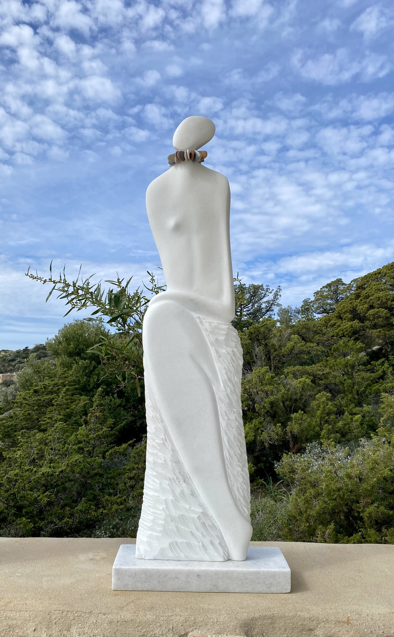 Een vrouwelijke wereld uit steen geboren. Mijn beelden dragen “het eeuwig vrouwelijke” in zich. Zij vertegenwoordigen mijn communicatie met de steen, de lijnen en structuren die zijn ontstaan door de tijden en de steen haar eigen taal geeft. Met name het samengaan van mijn innerlijke taal en die van de steen is één van de boeiende aspecten van het werken met steen: het bevrijden van een nieuwe wereld uit het eens zo vormeloze.