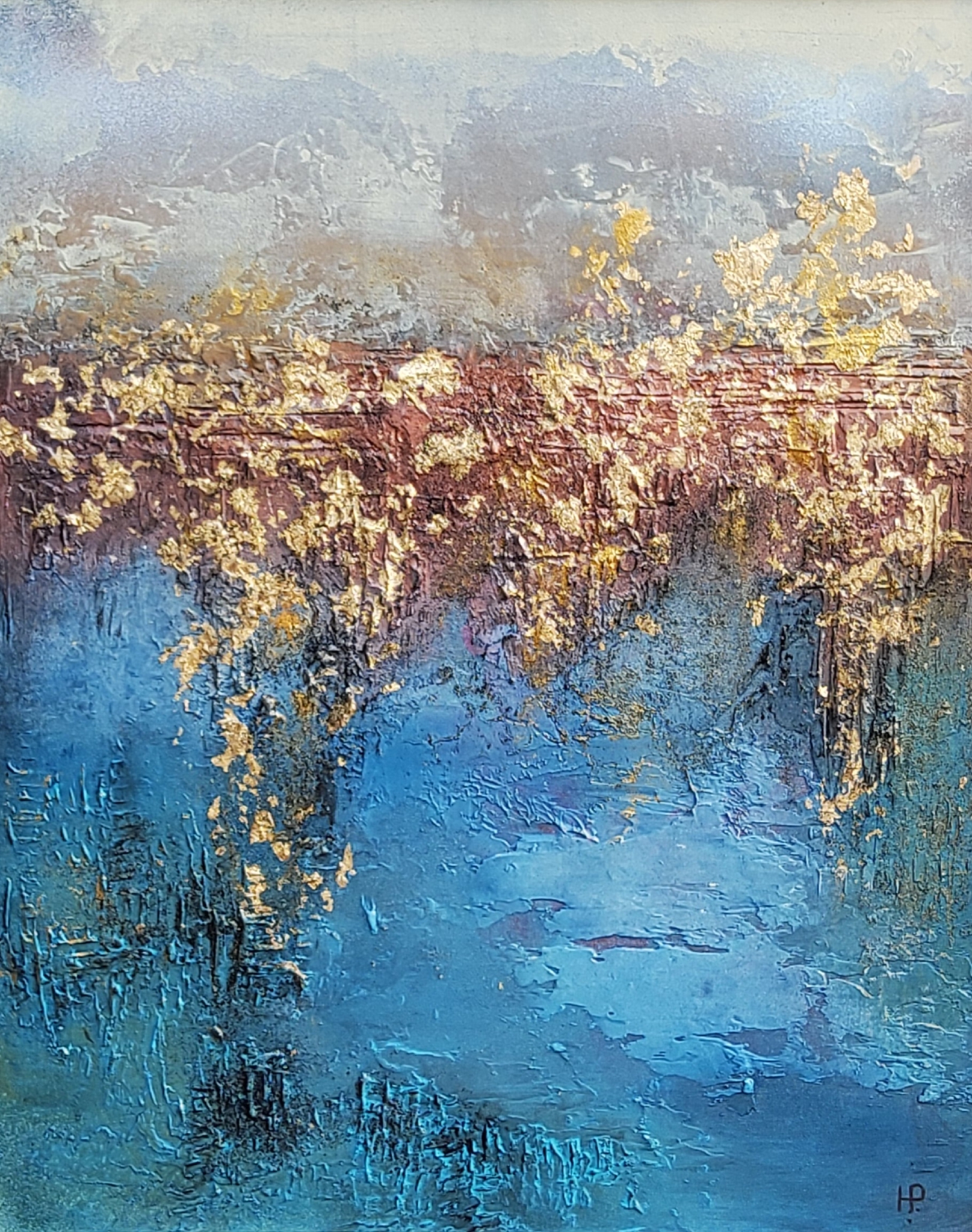 Dit schilderij is geschilderd op mdf en voorzien van een aluminium (Barth) lijst van 2x2cm. Voorzien van een goed ophangsysteem. Bladgoud, mica pigmenten en blauw en grijze tinten.