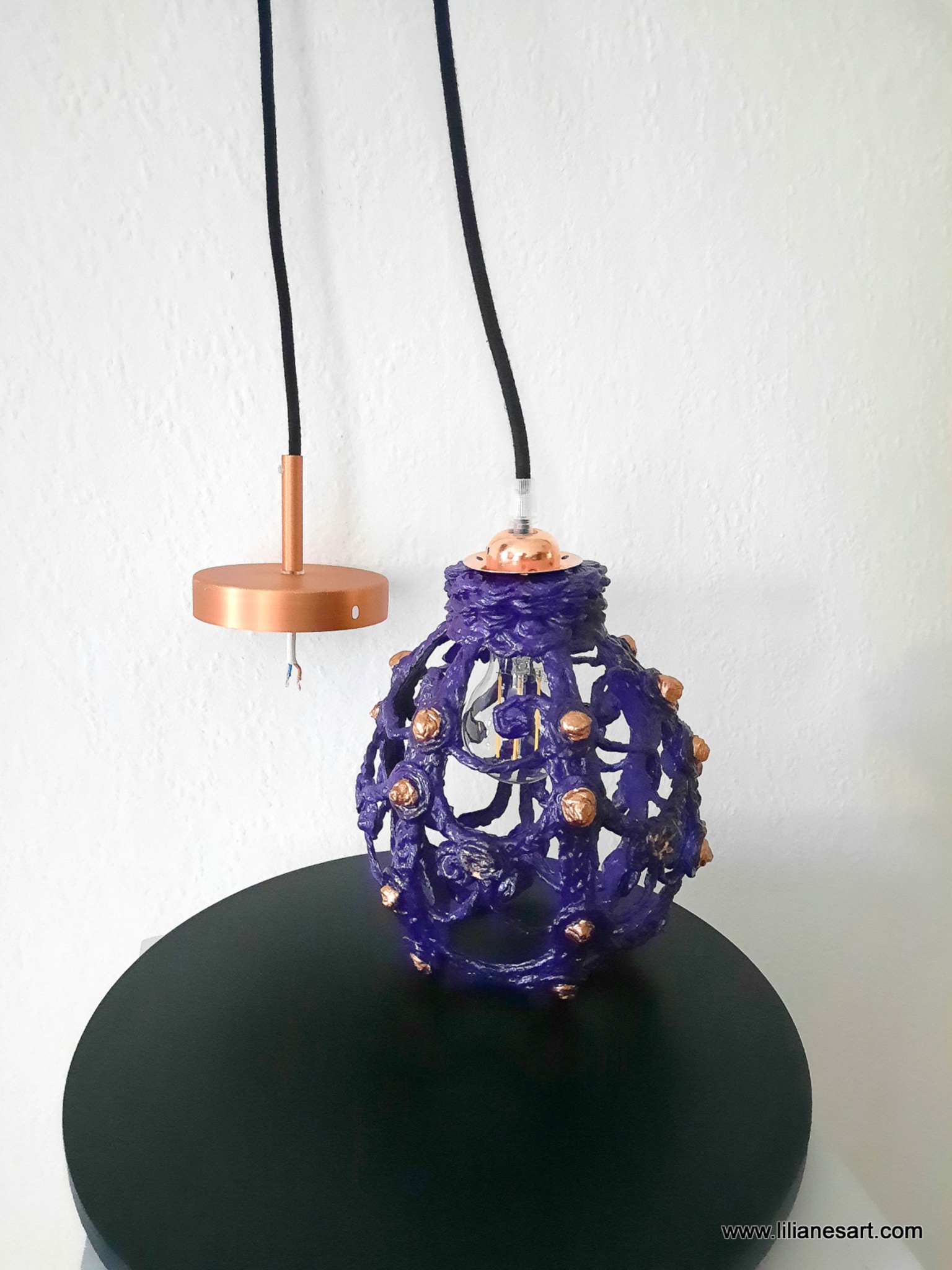 De afmetingen zijn in circa afmetingen. Beschilderd met paars en koper, de kabels en plafondkap is van het Italiaanse merk Creative Cables. Fitting,snoer en plafondkap zijn CE goedgekeurd.