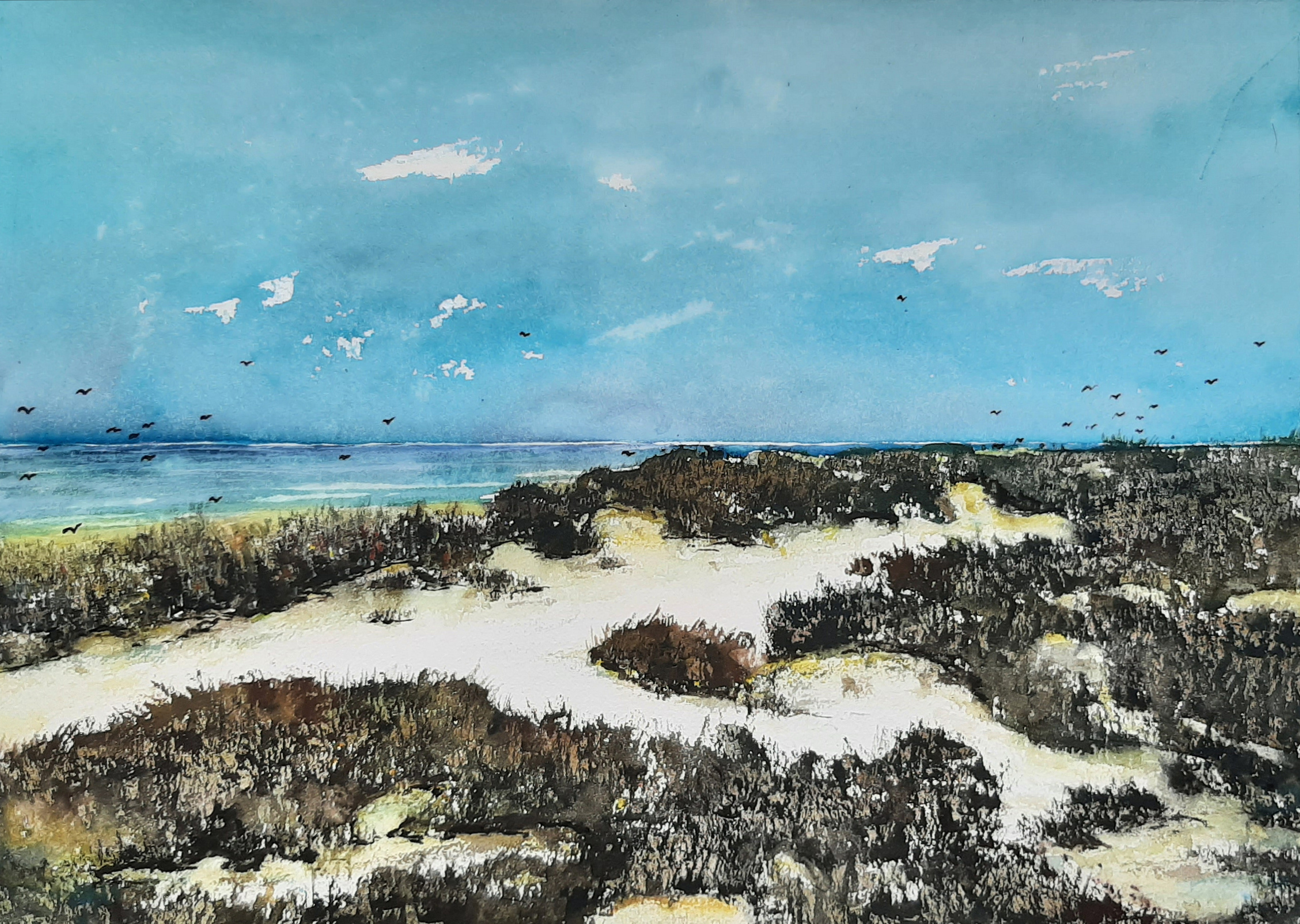 In september 2022 ben ik voor het eerst op Schiermonnikoog. Texel en Ameland hadden we al eerder ontdekt. Schiermonnikoog is niet alleen een paradijs, maar ook een schilderparadijs. Thuisgekomen grijp ik onmiddellijk met aquarelpenseeel. Het wordt een duinlandschap. In mijn dagboek van 7 september noteer ik: We horen van de locale schilder Minnen Onnes, fietsen over het Minne Onnes pad en lopen vervolgens een eind richting strand. Onmetelijk lijkt het hier. Een universum. Heel in de verte bewegen kleine figuurtjes. Zouden mensen kunnen zijn. Of ruimtereizigers. De zon maakt er een feest van. Ik weet nu al, dat ik, eenmaal thuisgekomen, me weer aan het duin op doek of papier zal wagen. Net als vorig jaar na terugkomst van Ameland. Waar helderwit stuifzand me inspireerde tot een aantal aquarellen. En hier sta ik dan: zonder penseel of wat dan ook. Dat maakt hulpeloos. Gewoon inspiratie opdoen. Het aquarel is gemaakt op 300grams Hahnemüle-Cézanne papier, 30x40