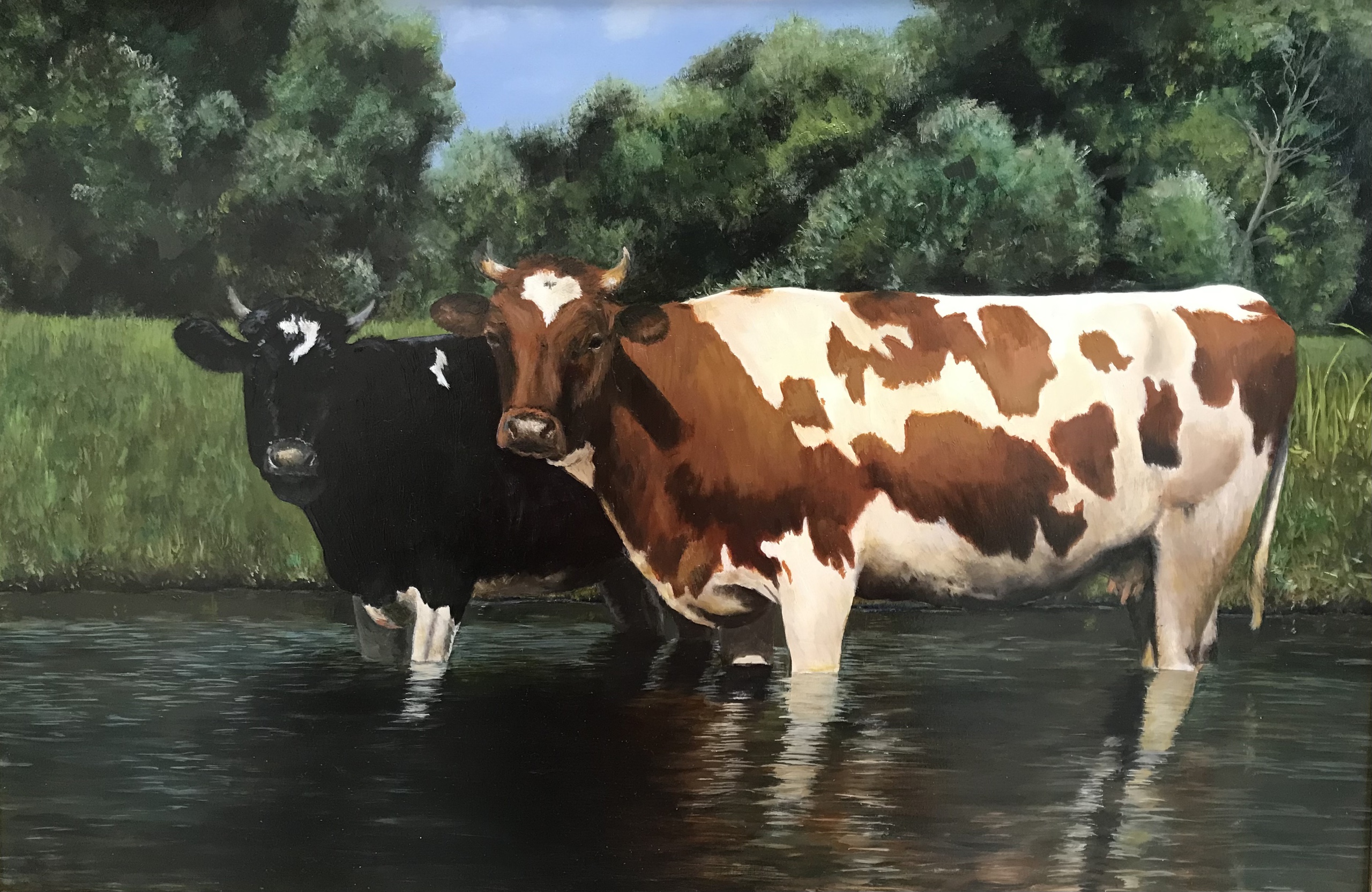 Roodbonte en zwartbonte koe aan het pootjebaden. Zwarte lijst met gouden randje van lijstenmaker