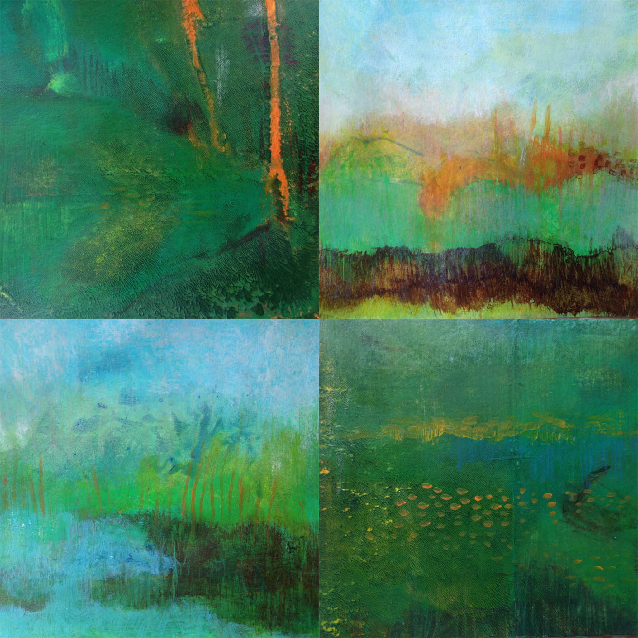 Overzicht van enkele landschapjes. acrylverf, pigmenten, oliepastel.