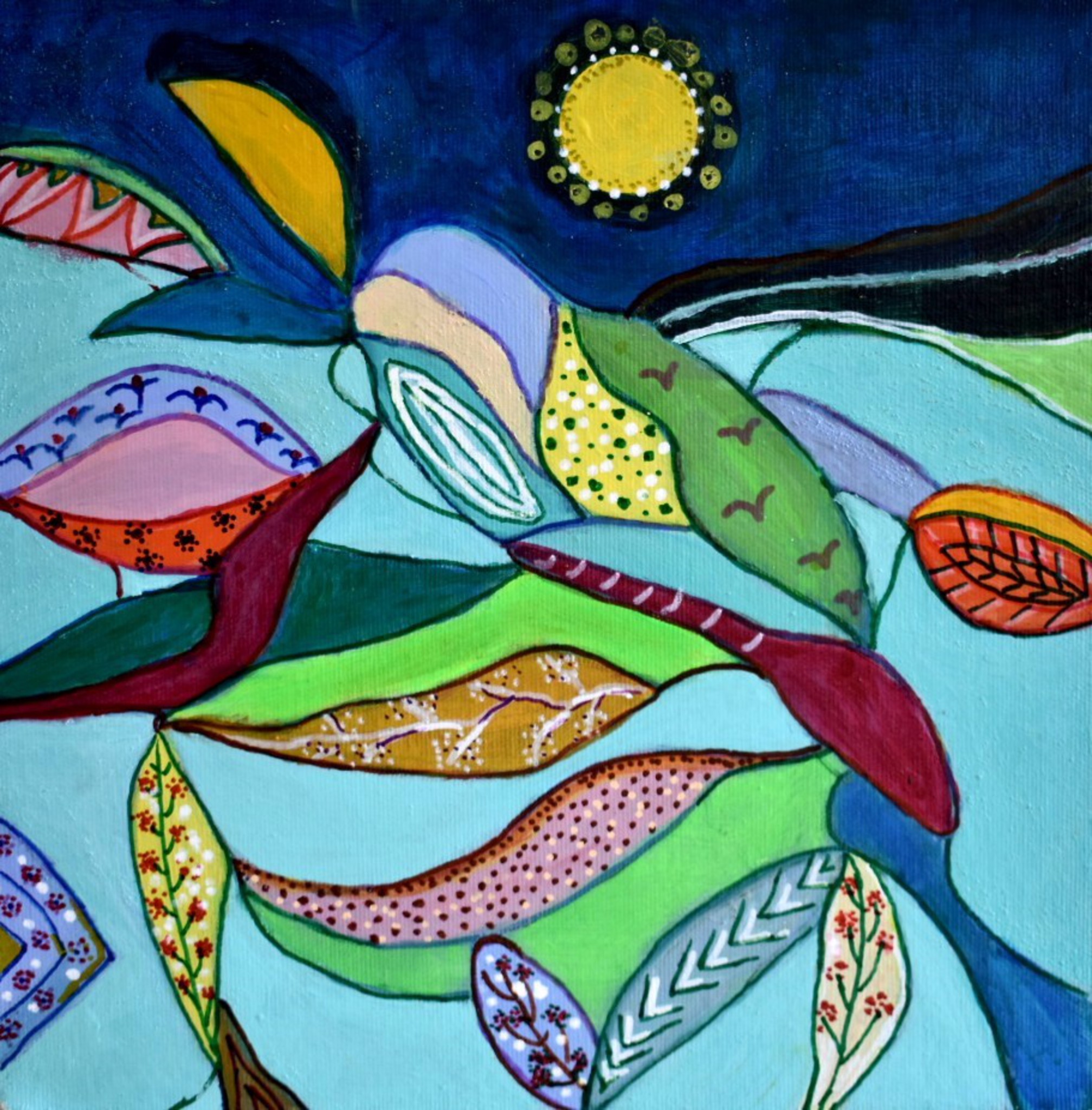 Meditatieve, symbolische kunst en bijzondere mandala's. Verrassende, kleurrijke tekeningen en schilderijen in acryl en zandpasta.