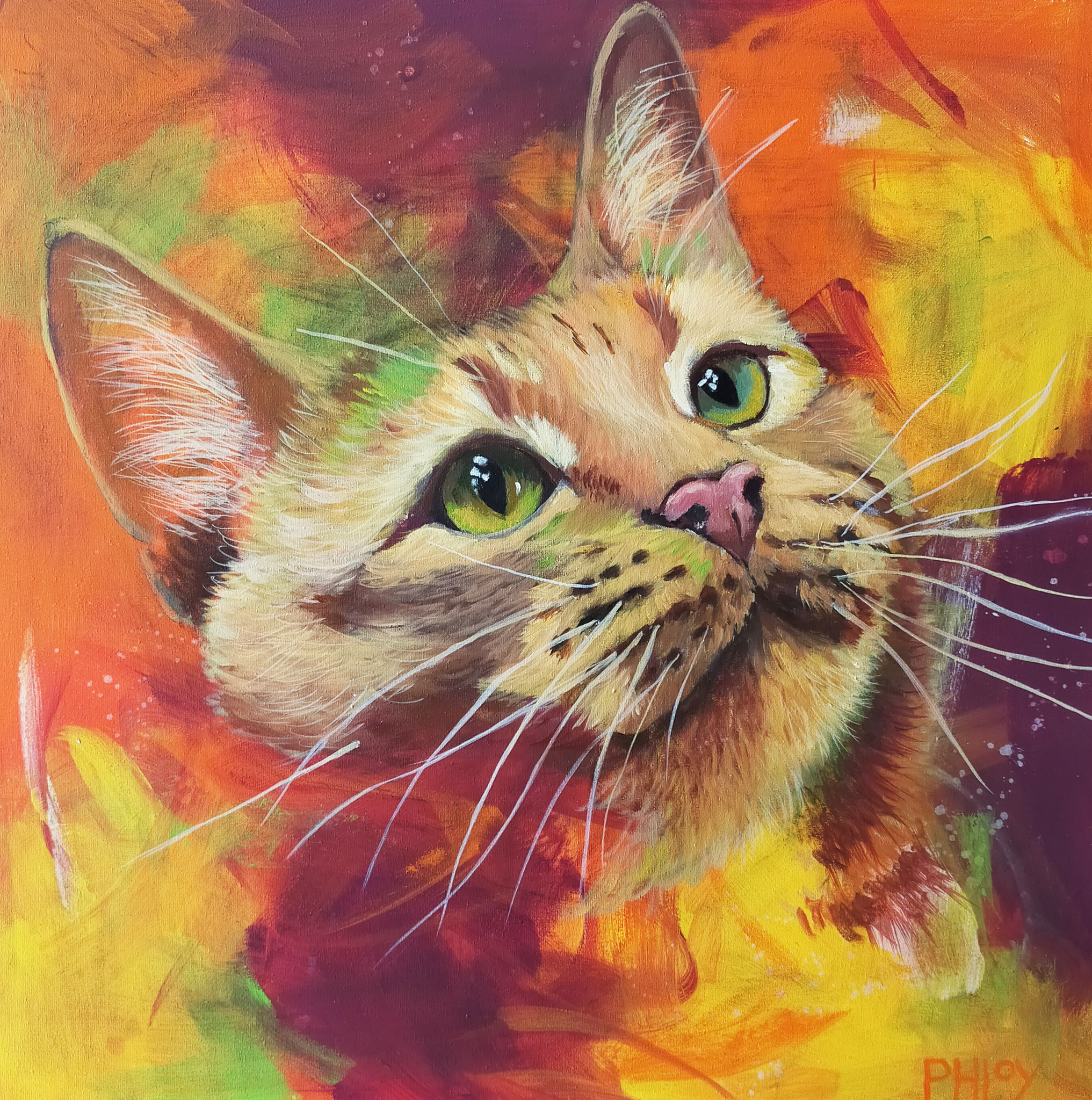 Deze kat is erg geinteresseerd in een vogeltje waarschijnlijk. Hopelijk krijg ze hem niet te pakken. Zij is geschilderd met olieverf in een abstracte achtergrond in acryl.