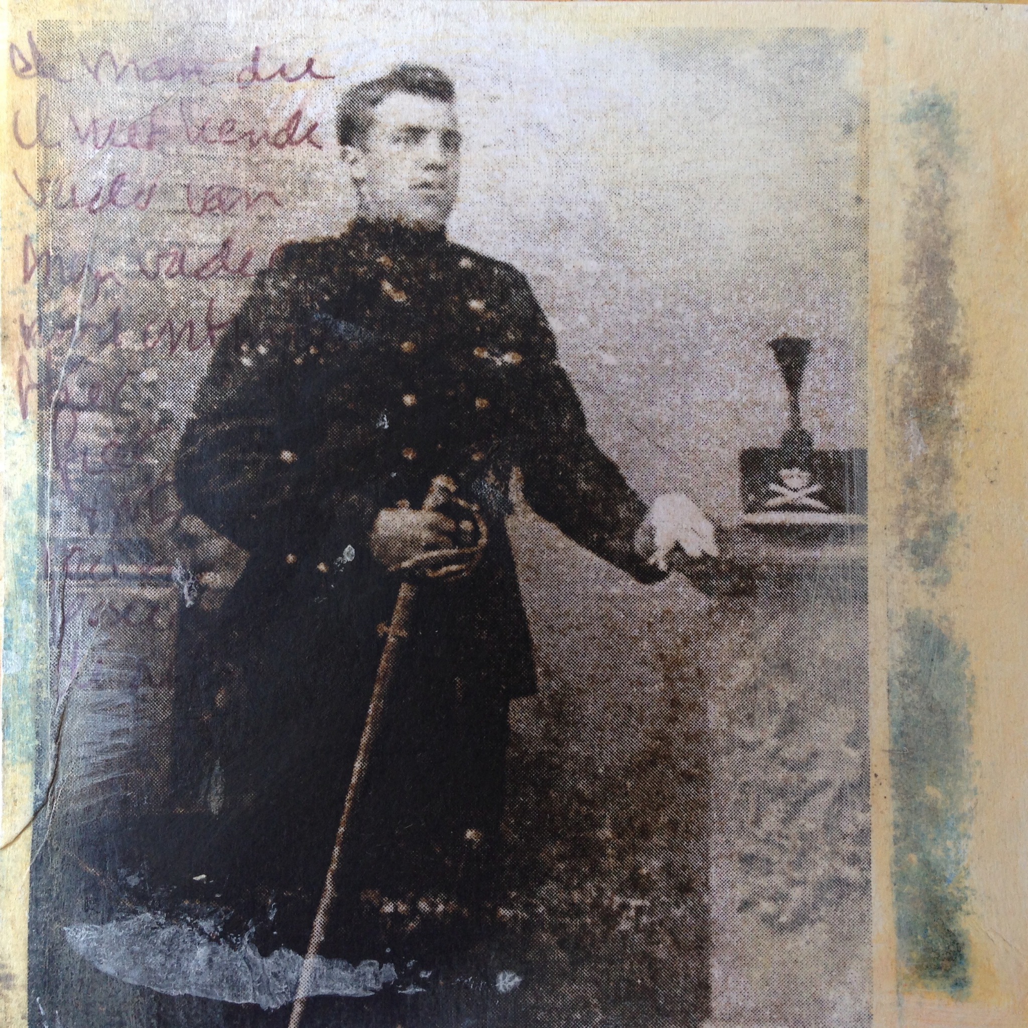 De man die ik nooit gekend heb, vader van mijn vader: hier fier en trots poserend voor de fotograaf. Tansfer techniek, acrylverf en kleurpotlood