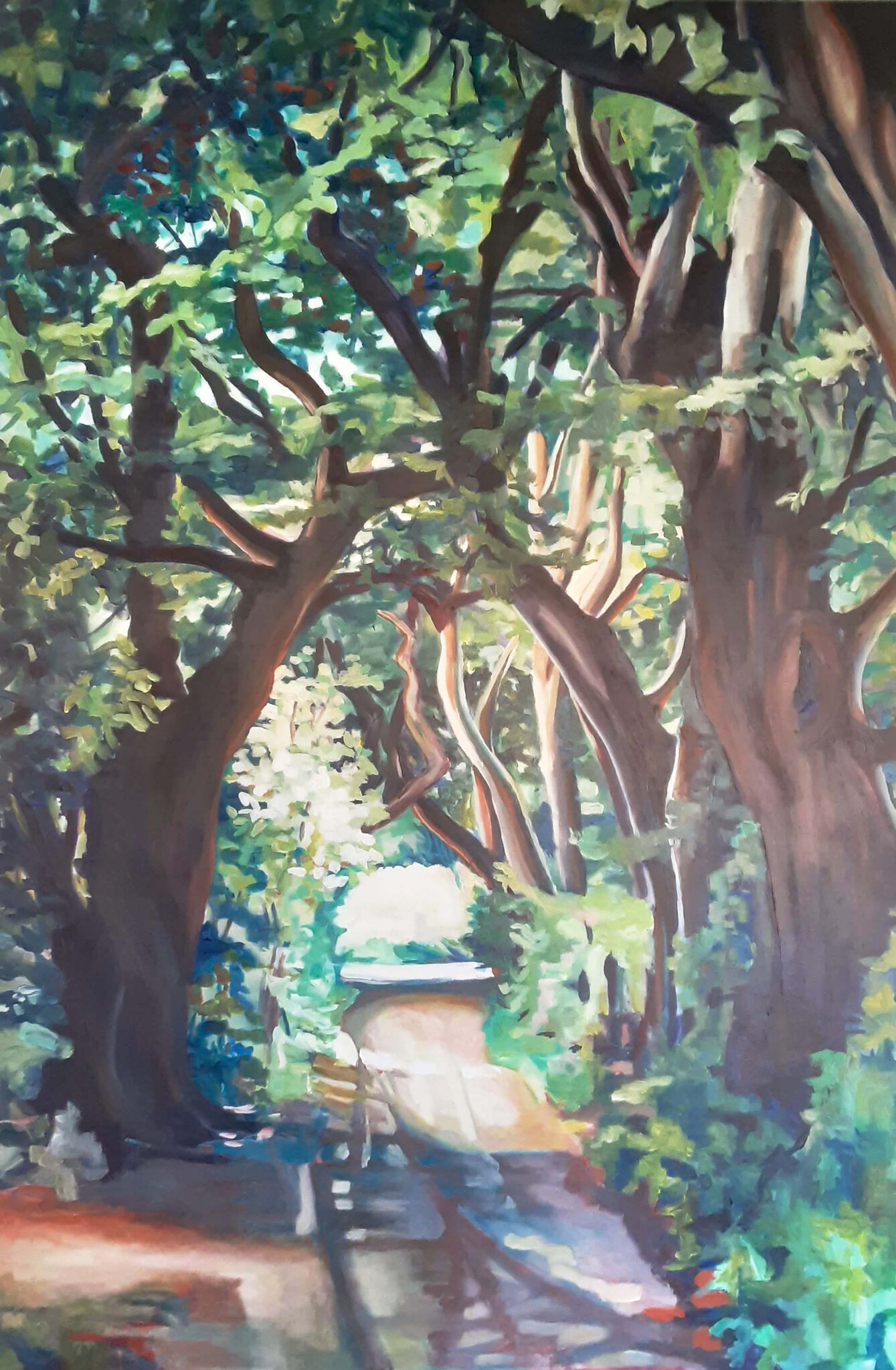 Hier liepen de dames vroeger om uit de zon te blijven. Bij een storm vorig jaar zijn er enkele beuken omver gewaaid, waardoor er een opening in het bladerdak is ontstaan. Mijn vorige werk, Kathedraal Amerongen, is niet meer in mijn bezit. Met plezier heb ik het nog eens geschilderd op groot formaat, in de huidige situatie