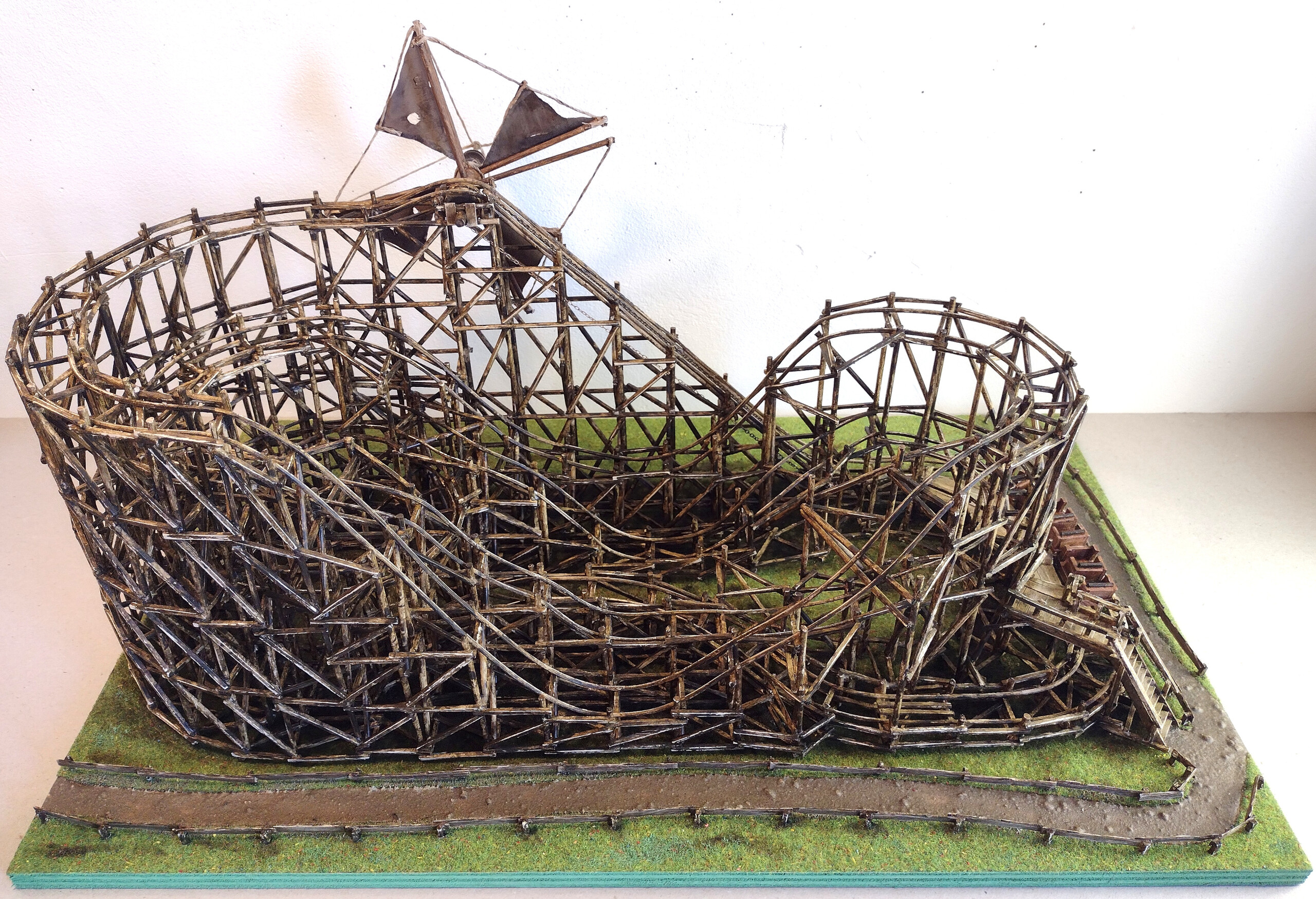 Fantasiemodel, windaangedreven achtbaan gemaakt van lucifers en sateprikkers.