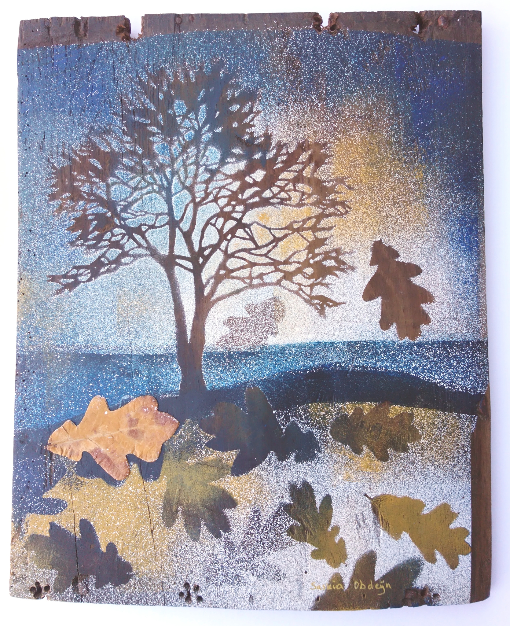 Silhouet van een eik en eikenbladeren op een oude eikenhouten plank. Gemaakt met sjabloon en spuitverf.