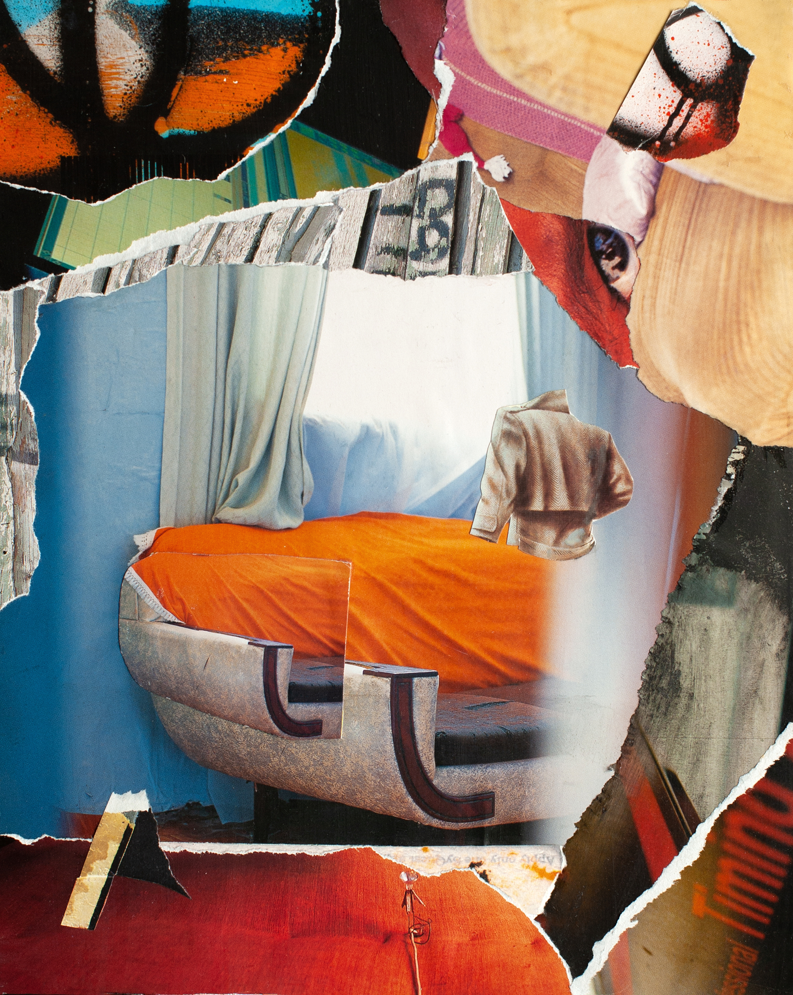 De foto's in een tijdschrift deden me denken aan een futuristische badkamer. Dit effect heb ik benadrukt door verschillende kleuren en vormen te gebruiken. De collage is op canvas geplakt en kan aan de muur hangen.
